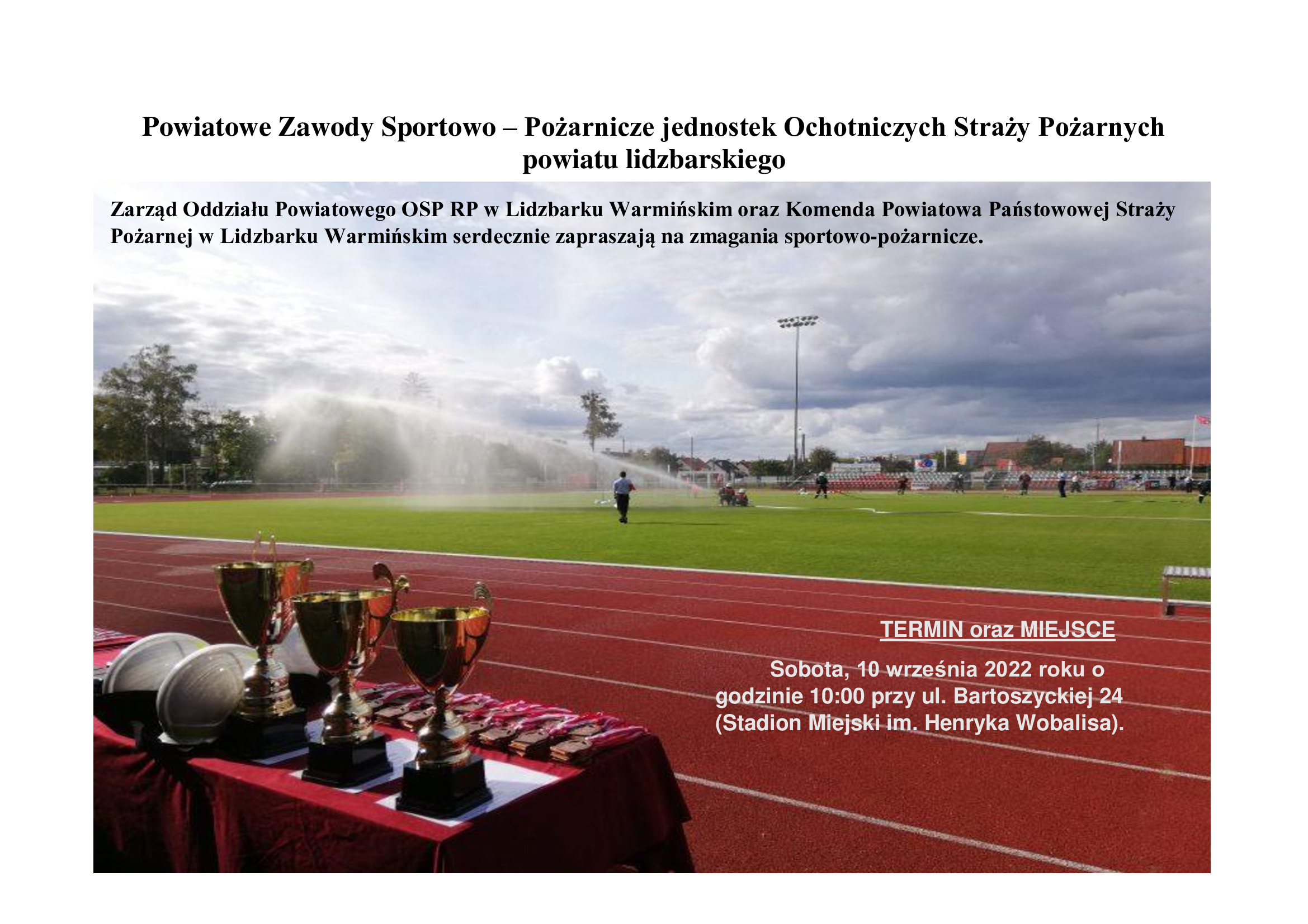 10 września 2022 roku (sobota) o godzinie 10:00 na terenie stadionu Miejskiego w Lidzbarku Warmińskim przy ul. Bartoszyckiej 24 odbędą się Powiatowe Zawody Sportowo Pożarnicze Ochotniczych Straży Pożarnych powiatu lidzbarskiego, na które serdecznie zapraszają: