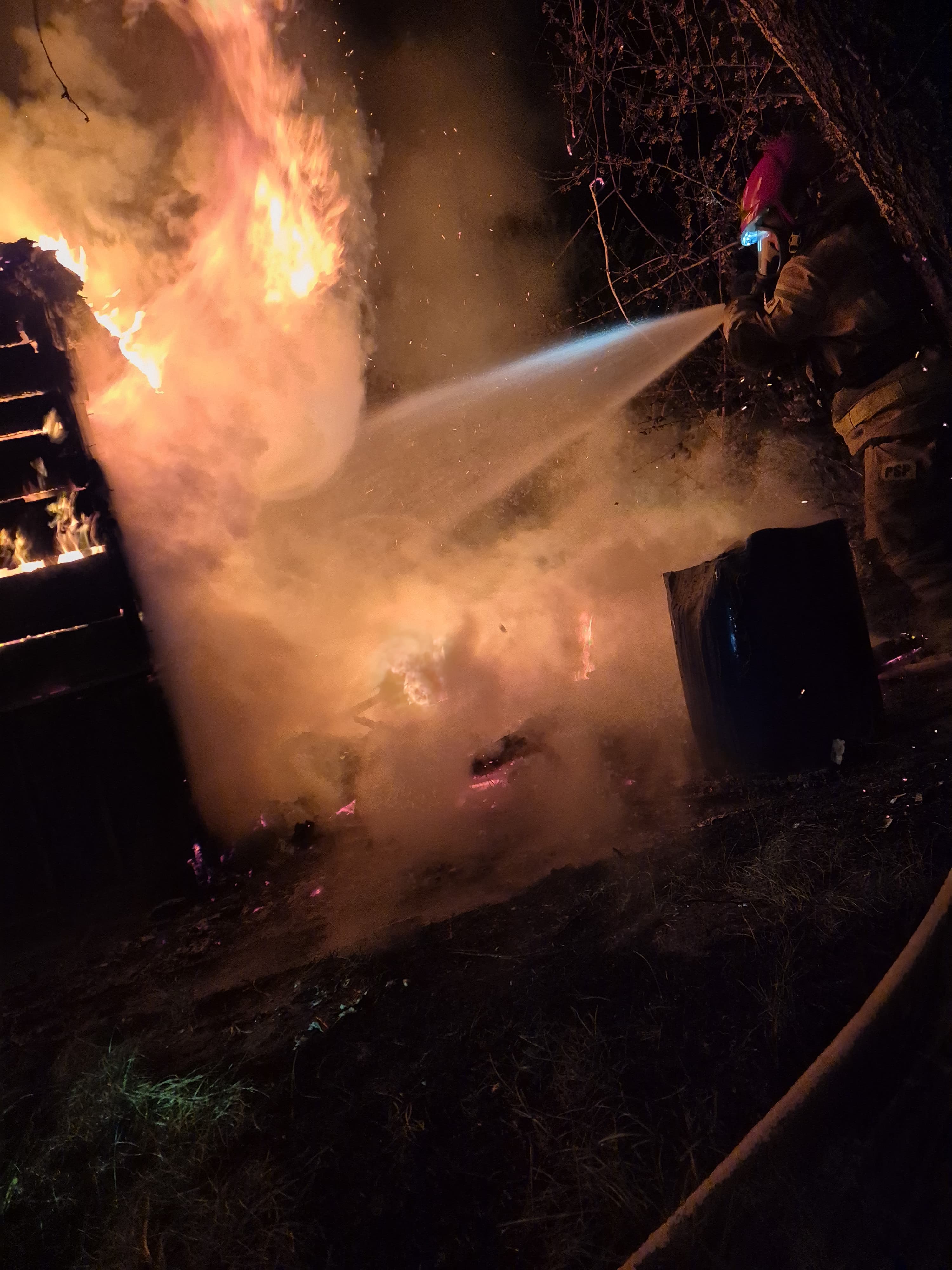 Po przybyciu na miejsce dyspozycji zastępów z Jednostki Ratowniczo-Gaśniczej, zastano w pełni rozwinięty pożar obiektu działkowego o powierzchni około 12m2 o drewnianej konstrukcji.