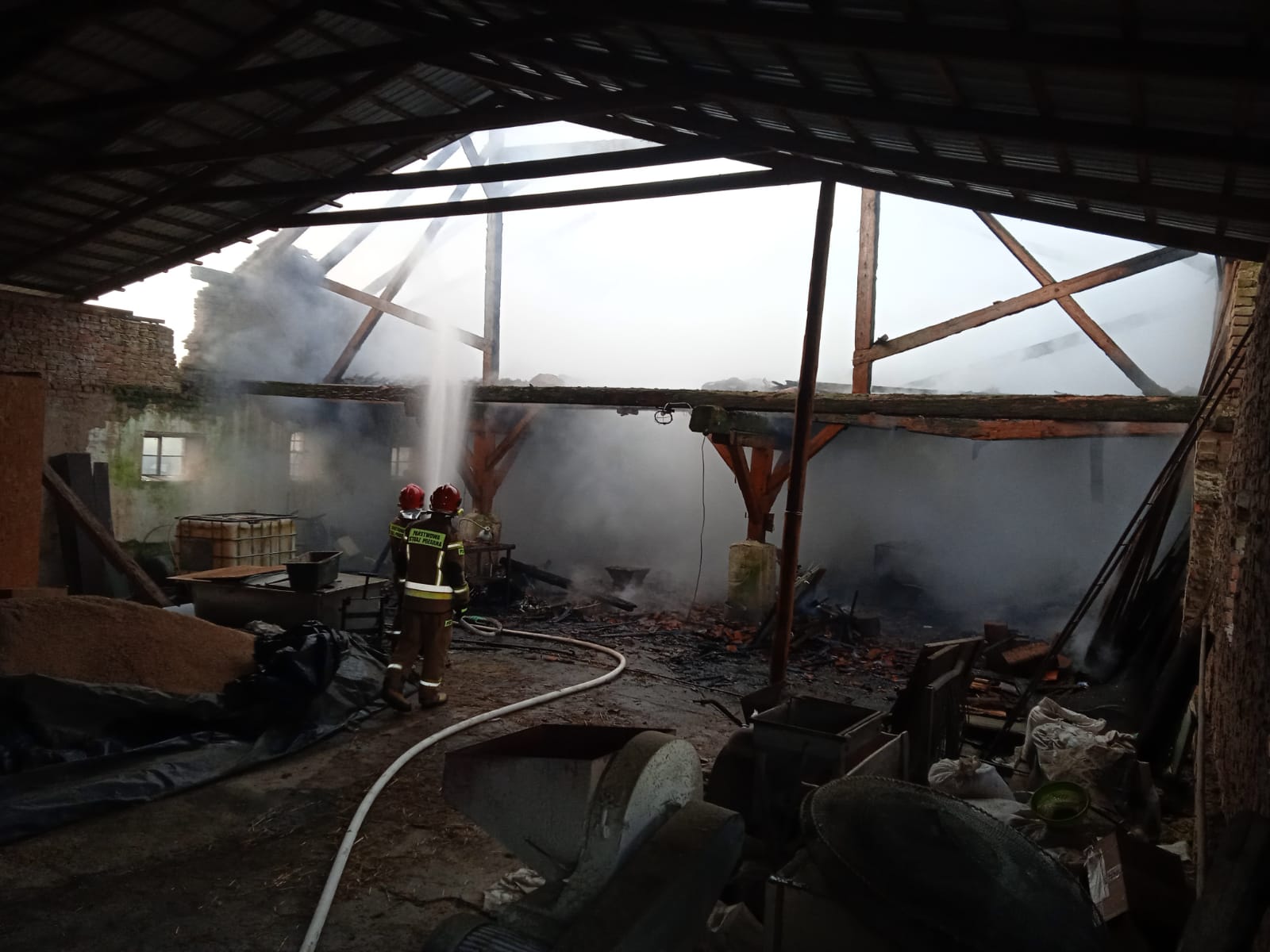 Po przybyciu na miejsce zdarzenia strażaków, zastano zaawansowany pożar obory, która składała się z dwóch części. Poszycie dachowe uległo spaleniu pozostawiając elementy konstrukcyjne dachu. Wnętrze również całkowicie objęte było ogniem. Z informacji uzyskanych od właściciela mienia, w środku znajdować się miał drób w ilości około 170 sztuk. Dodatkowo bezpośrednio zagrożona była również stodoła, która znajdowała się w odległości około 3 metrów od palącego się obiektu. Zasilanie w energię elektryczną w budynku zostało wyłączone.
