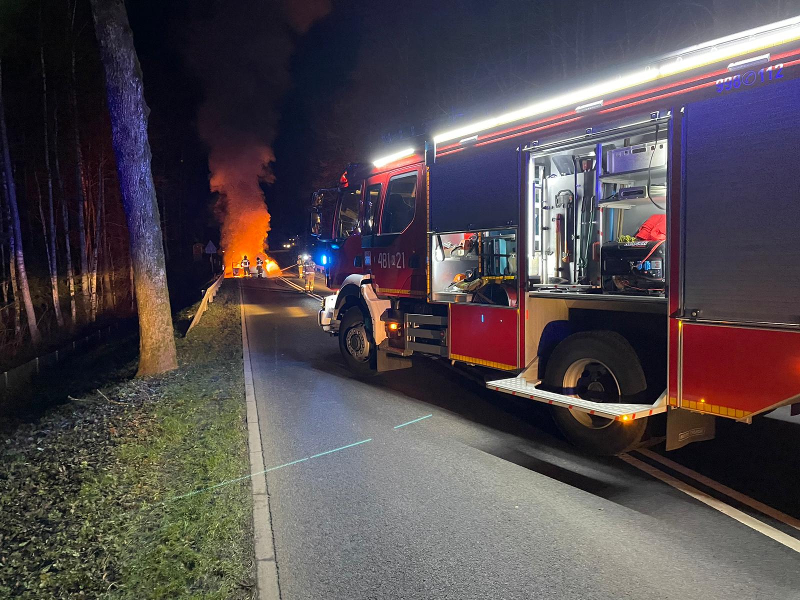 Po dojeździe na miejsce dyspozycji, zastano pojazd marki Ford Fiesta stojący na prawym pasie drogi wojewódzkiej w stronę Lidzbarka Warmińskiego, który całkowicie objęty był ogniem. Dwie osoby podróżujące, opuściły pojazd samodzielnie.