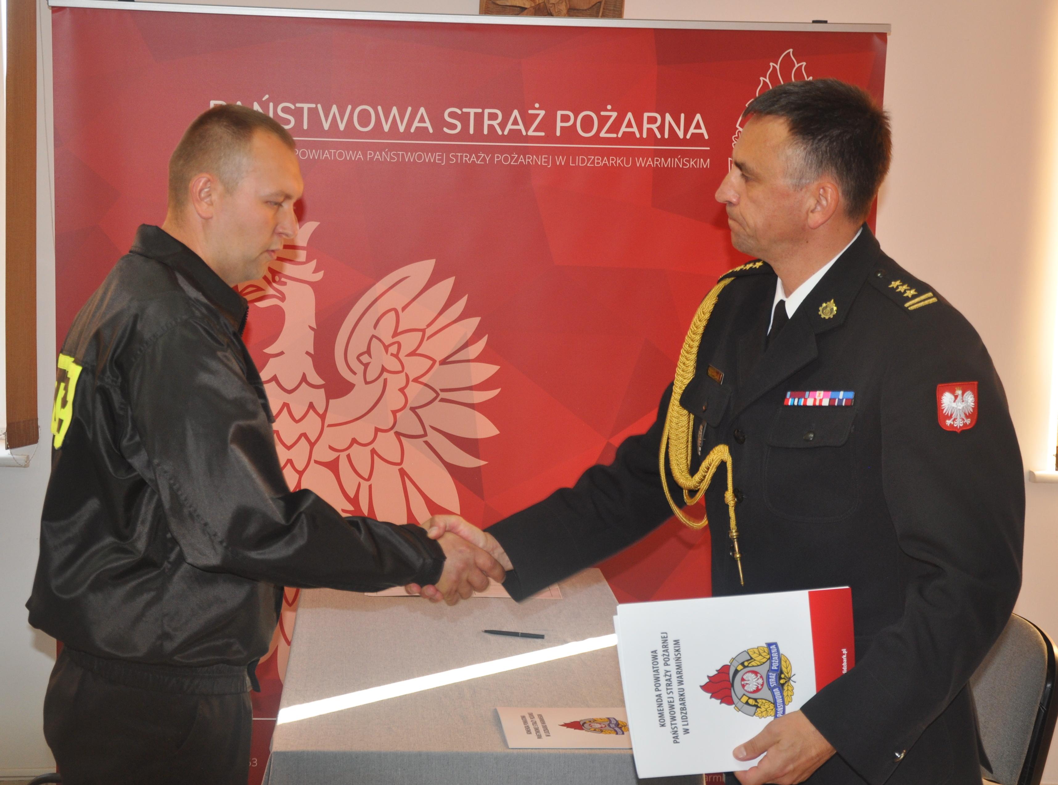 Ślubowanie przyjął Komendant Powiatowy Państwowej Straży Pożarnej st.bryg. Rafał Szymukowicz w obecności Zastępcy Komendanta Powiatowego Państwowej Straży Pożarnej bryg. Cezarego Kalinowskiego oraz funkcjonariuszy i pracowników lidzbarskiej Komendy.
