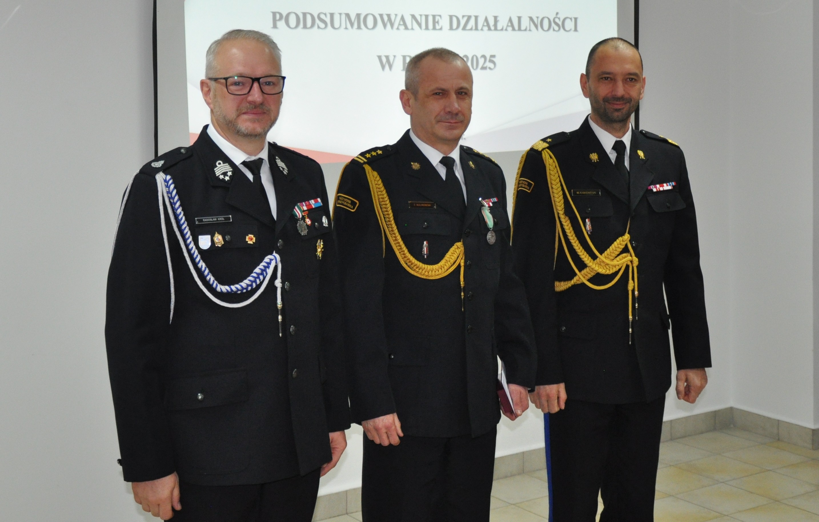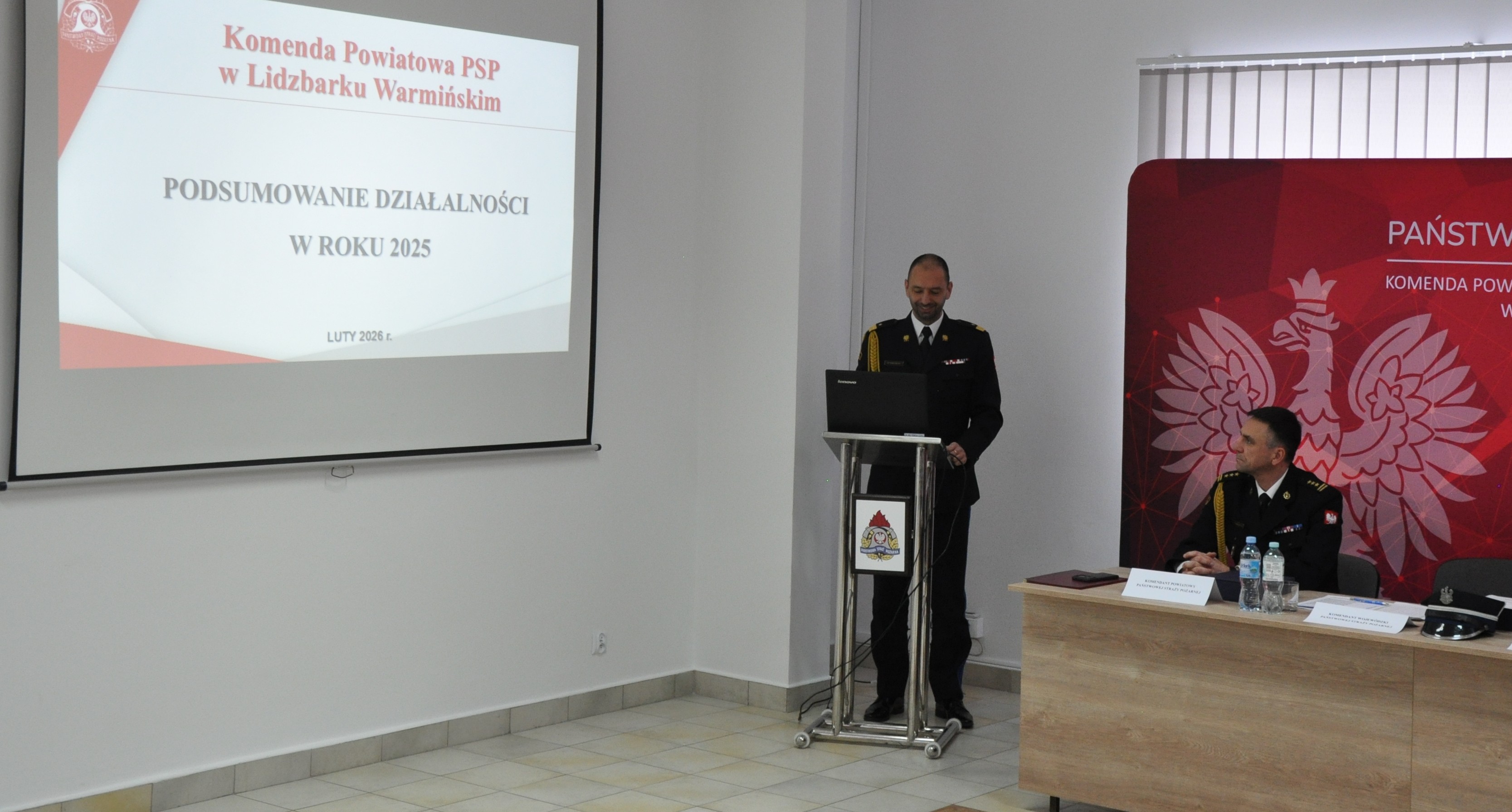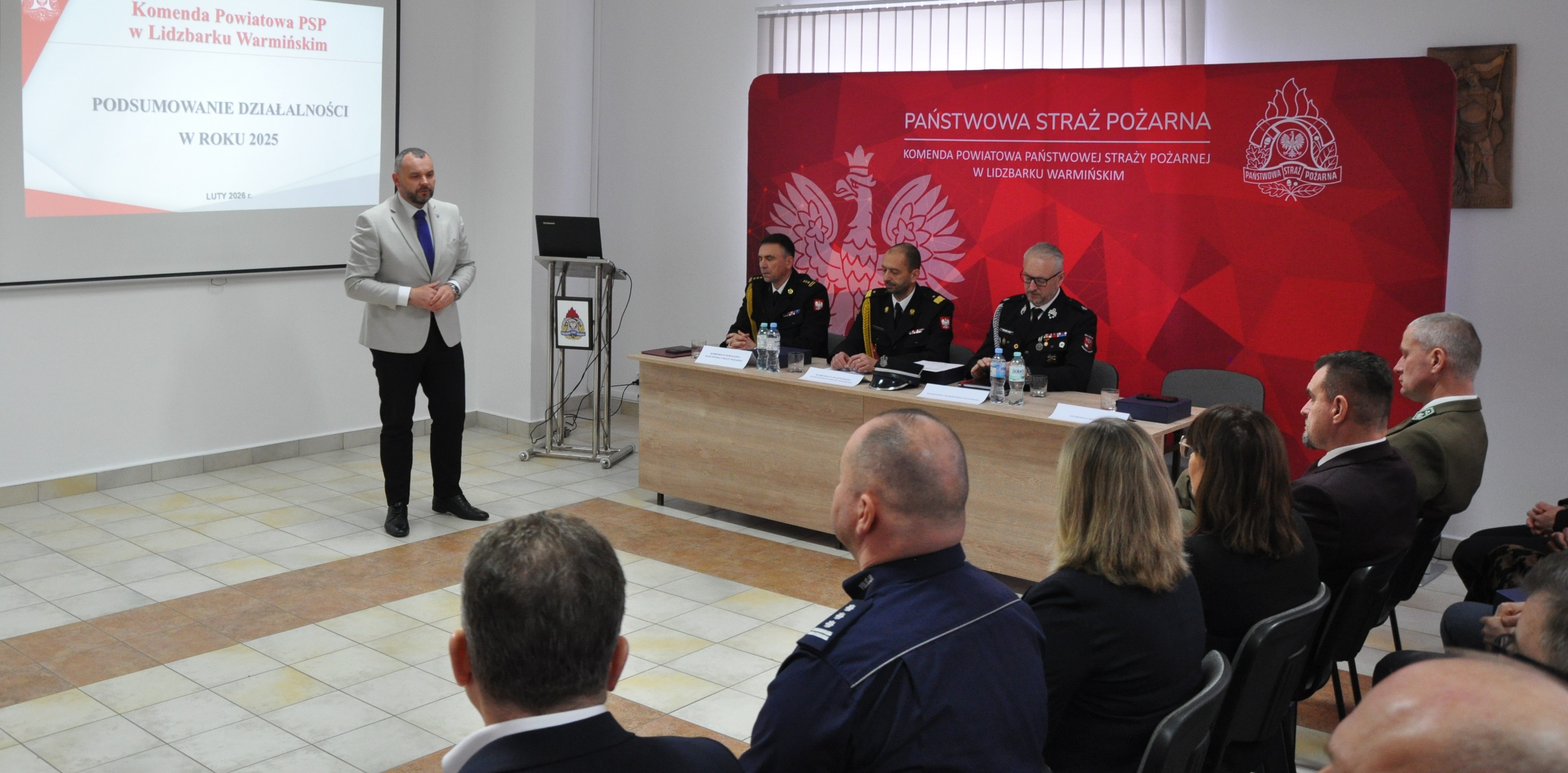 Po tym uroczystym akcencie Komendant Powiatowy rozpoczął prezentację podsumowującą całoroczną działalność lidzbarskiej komendy, oddając na wstępie hołd zmarłym strażakom minutą ciszy. St.bryg. Rafał Szymukowicz przedstawił dane dotyczące działalności jednostki w minionym roku, ze szczególnym uwzględnieniem liczby i rodzaju działań podejmowanych przez strażaków Jednostki Ratowniczo-Gaśniczej oraz druhów Ochotniczych Straży Pożarnych. Omówił również zagadnienia z zakresu działalności operacyjno-szkoleniowej, kadrowej, logistycznej i kontrolno-rozpoznawczej, a także prewencji społecznej oraz współpracy z jednostkami OSP. Komendant zwrócił uwagę na inwestycje zrealizowane w 2025 roku oraz przedstawił planowane działania na rok 2026.