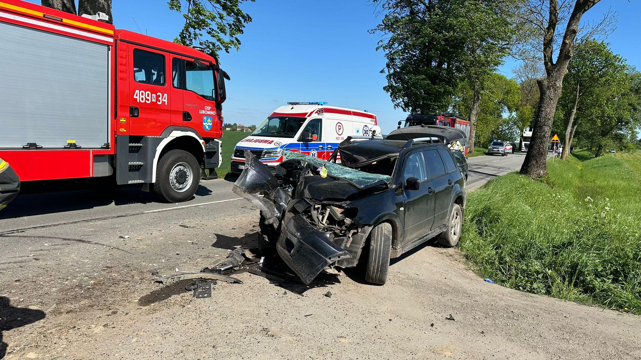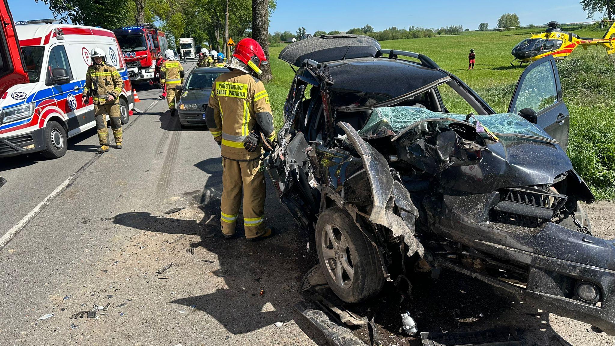 Strażacy po dojeździe na miejsce wypadku zastali uszkodzony samochód osobowy znajdujący się na pasie drogowym po uderzeniu w ciągnik rolniczy z naczepą. Wewnątrz auta znajdowała się kobieta, która w wyniku poniesionych obrażeń oraz deformacji karoserii nie była w stanie samodzielnie puścić wraku. Pozostali uczestnicy zdarzenia tj. kierowca Mitsubishi oraz kierowca maszyny rolniczej znajdowali się poza pojazdami.