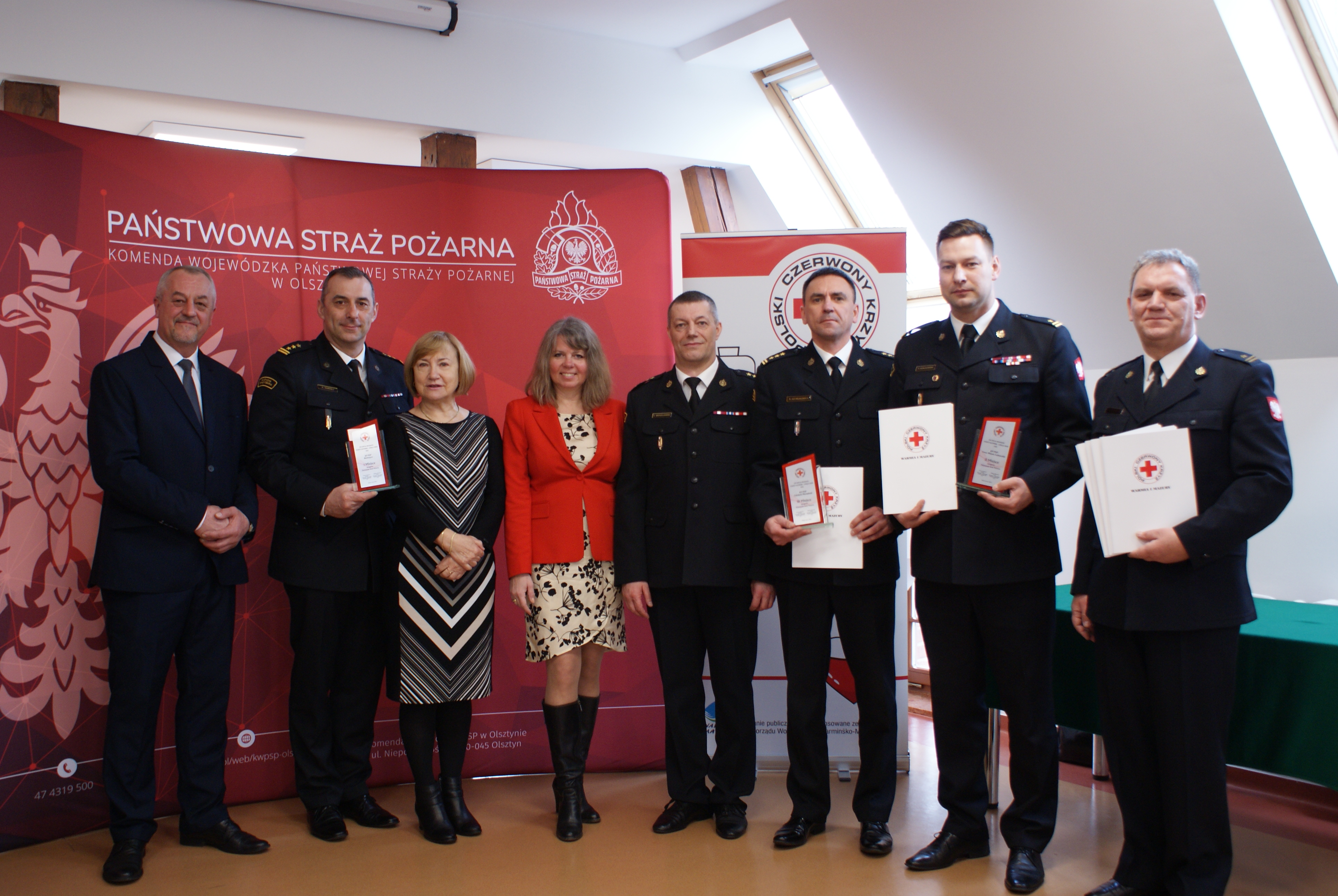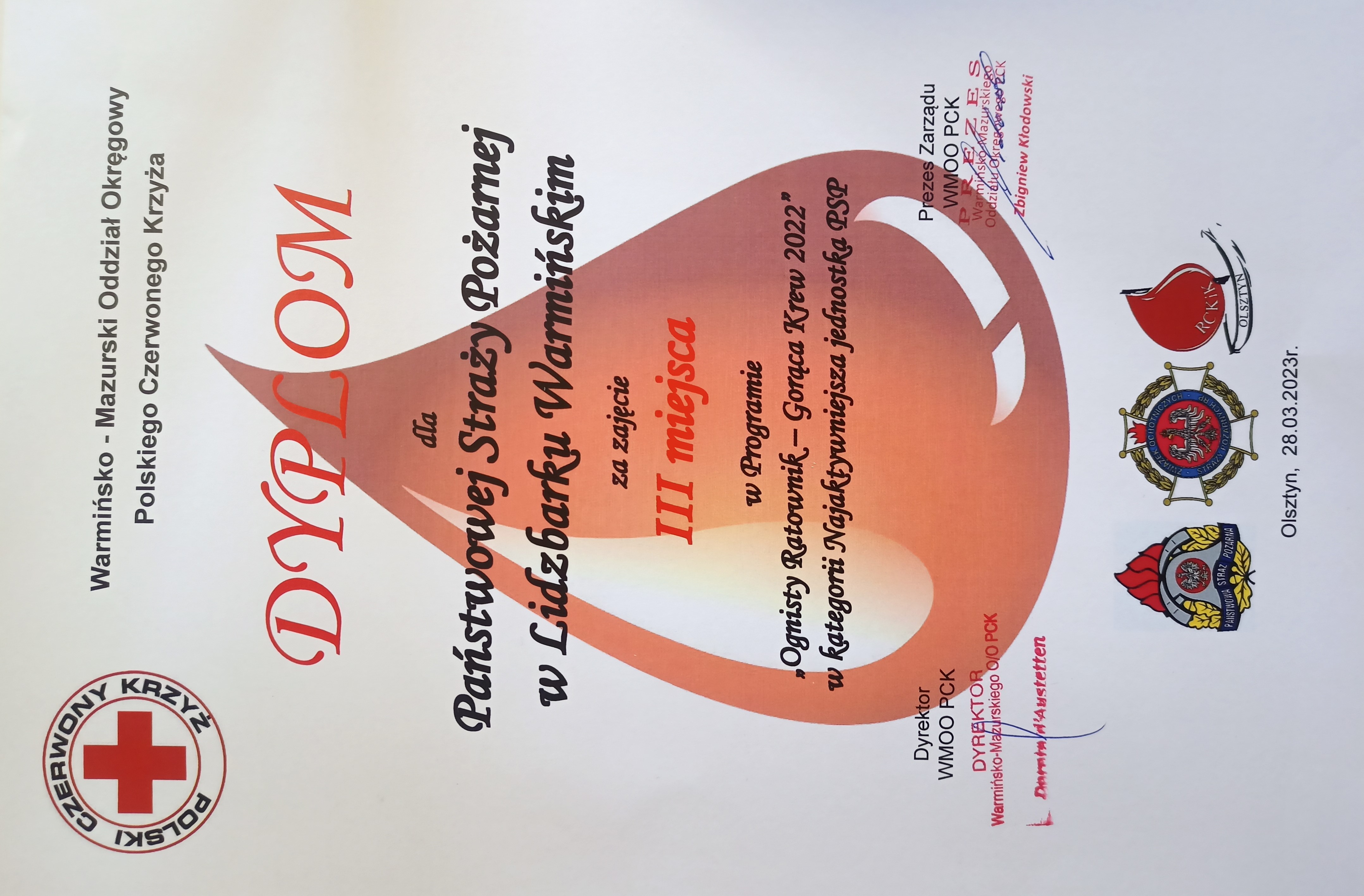 28 marca w sali konferencyjnej Komendy Wojewódzkiej Państwowej Straży Pożarnej w Olsztynie odbyło się podsumowanie XVII edycji programu „Ognisty Ratownik – Gorąca Krew 2022”. Prezes Warmińsko-Mazurskiego Oddziału Okręgowego PCK Zbigniew Zawadzki wraz z Dorotą d’Aystetten Dyrektorką Okręgową PCK oraz Dyrektorem ZOW ZOSP RP dh. Maciejem Jasińskim wręczyli okolicznościowe puchary i dyplomy jednostkom Państwowej Straży Pożarnej i Ochotniczych Straży Pożarnych woj. warmińsko-mazurskiego. W imieniu Warmińsko-Mazurskiego Komendanta Wojewódzkiego PSP wyrazy uznania Zarządowi Warmińsko-Mazurskiego Oddziału PCK za organizację akcji, a strażakom PSP i OSP za wkład i zaangażowanie przekazał st. bryg. Krzysztof Mierzejewski Zastępca Warmińsko-Mazurskiego Komendanta Wojewódzkiego PSP.