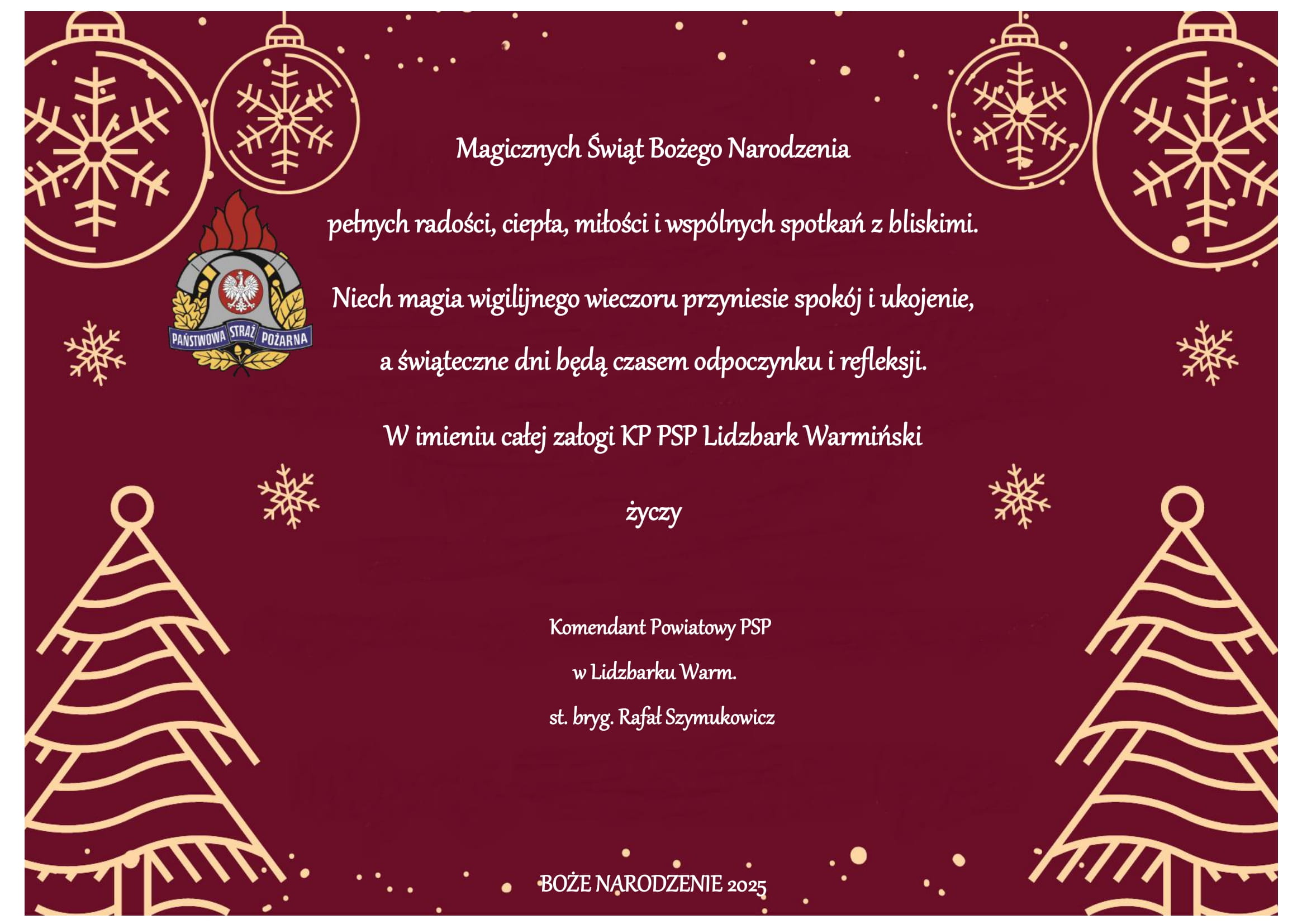 Życzenia Świąteczne Komendanta Powiatowego PSP w Lidzbarku Warmińskim 23.12.2025 Zdjęcia (1) Pokaż zdjęcie 1 z galerii.