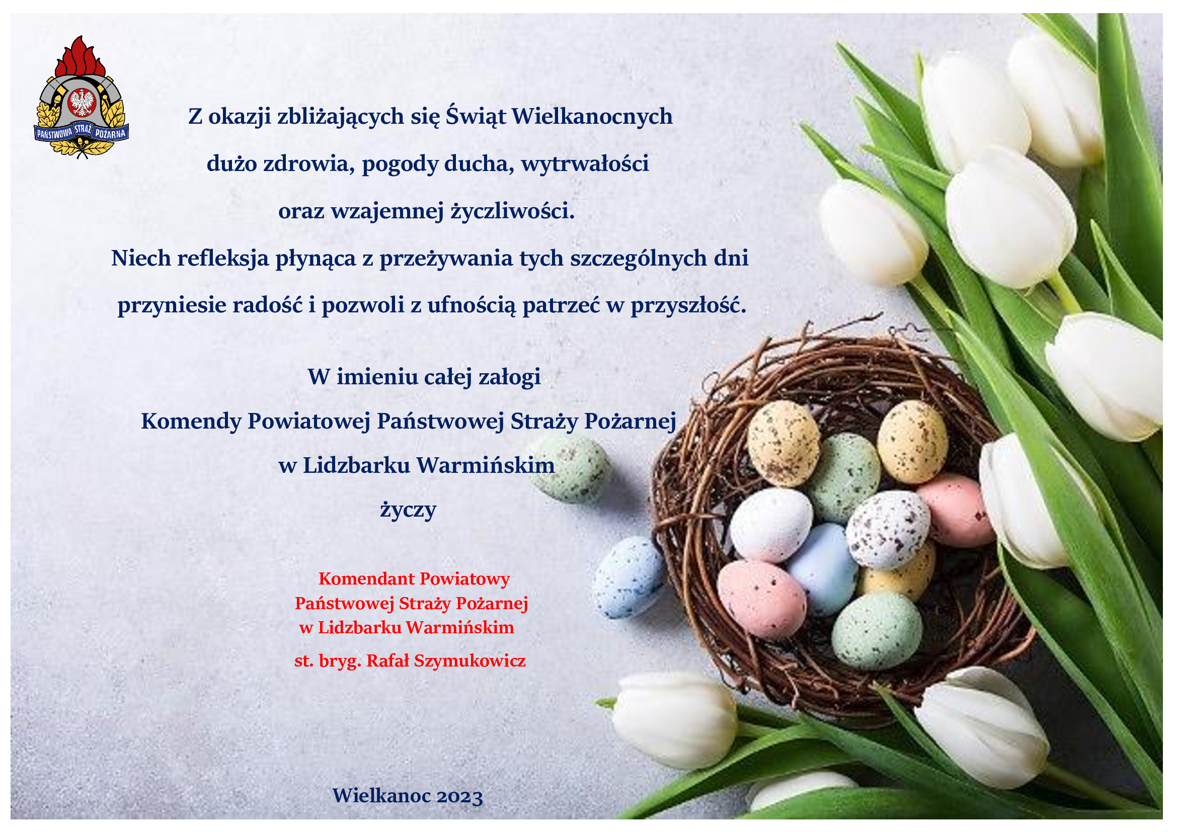 Życzenia Wielkanocne Komendanta Powiatowego PSP w Lidzbarku Warmińskim 06.04.2023 Zdjęcia (1) Pokaż zdjęcie 1 z galerii.