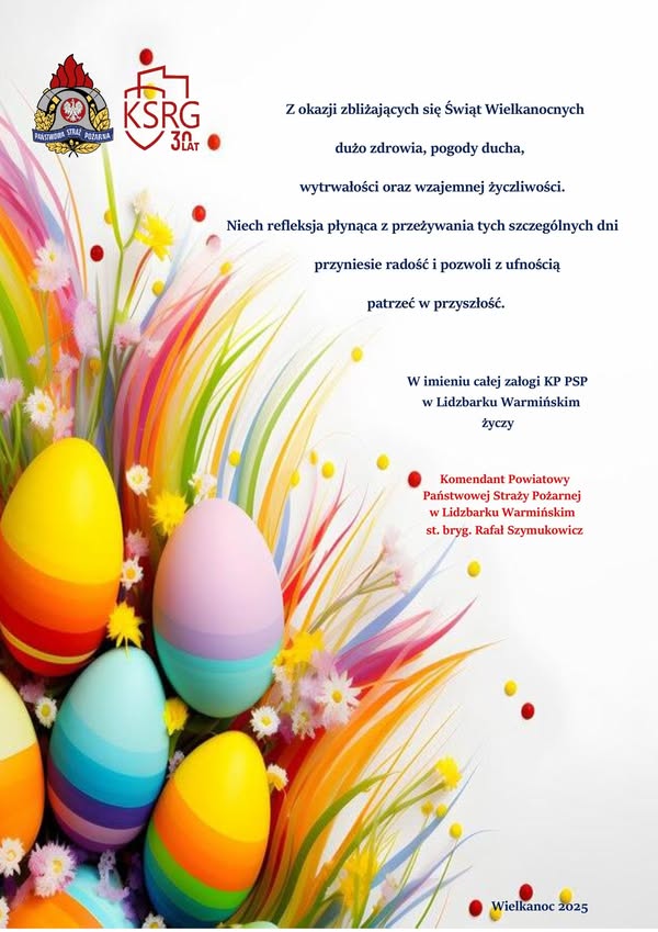 Życzenia Wielkanocne Komendanta Powiatowego PSP w Lidzbarku Warmińskim 17.04.2025 Zdjęcia (1) Pokaż zdjęcie 1 z galerii.