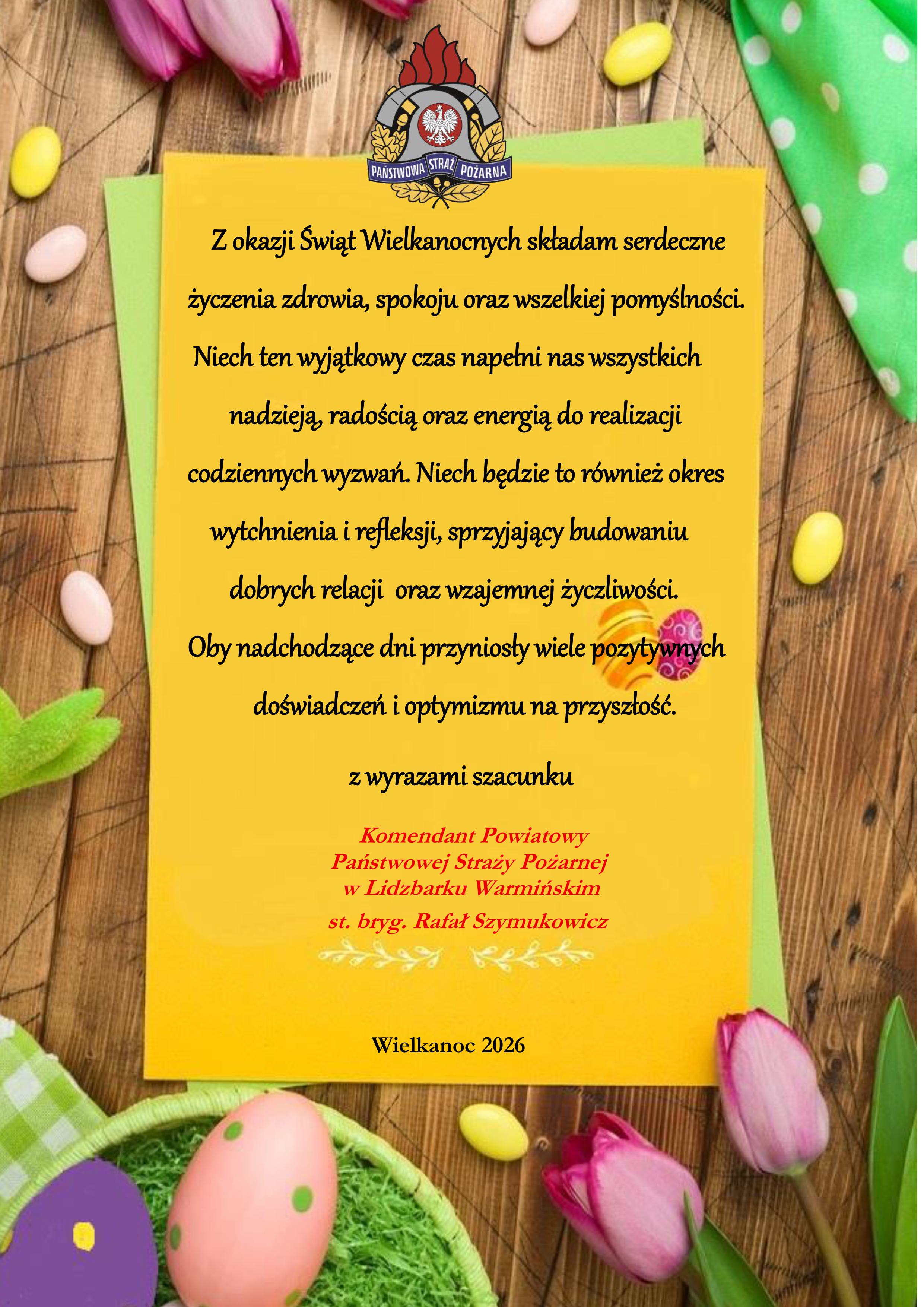 Życzenia Wielkanocne Komendanta Powiatowego PSP w Lidzbarku Warmińskim 03.04.2026 Zdjęcia (1) Pokaż zdjęcie 1 z galerii.