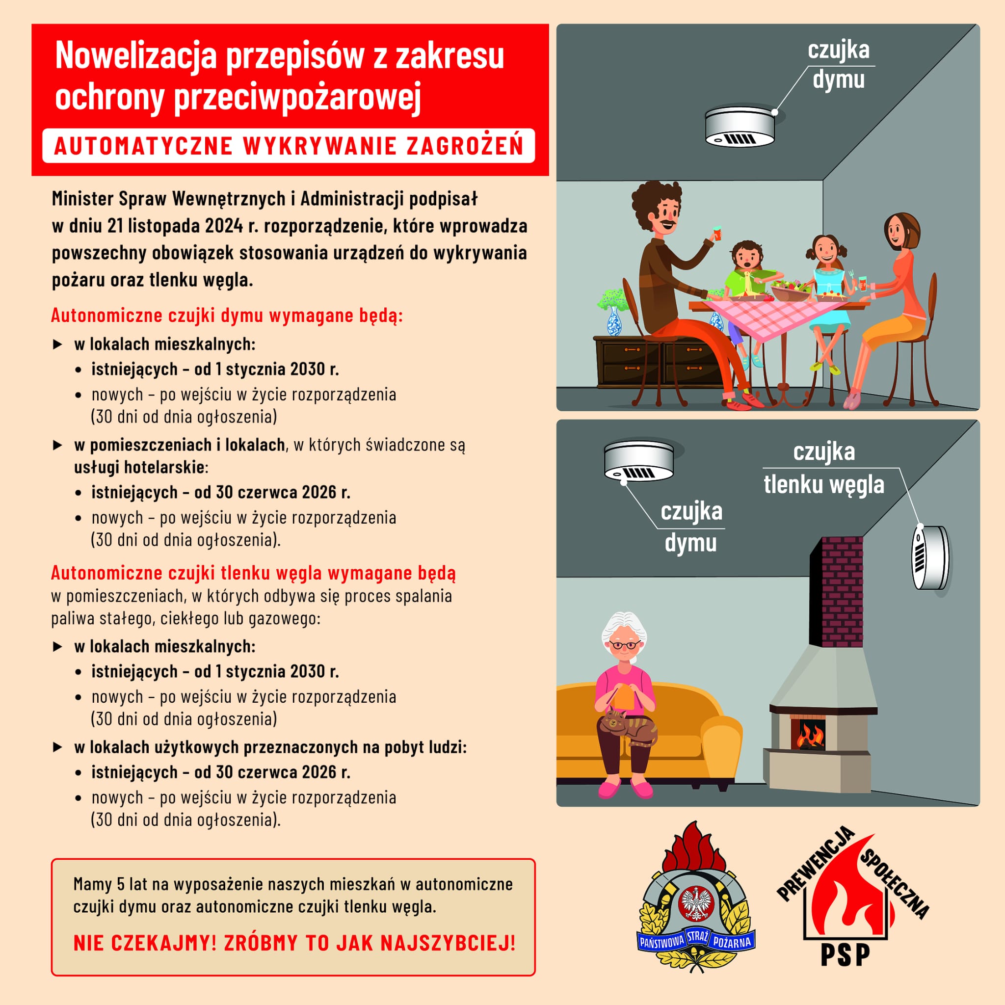 Jednocześnie tutejsza komenda zachęca do montażu autonomicznej czujki dymu i czujki tlenku węgla, urządzenia te są skutecznym sygnalizatorem zagrożeń i pozwalają z powodzeniem powiadomić o występującym zagrożeniu. Informujemy również, że w pomieszczeniu, w którym odbywa się proces spalania paliwa stałego, ciekłego lub gazowego, wchodzące w skład lokalu mieszkalnego lub użytkowego przeznaczonego na pobyt ludzi, posiadanie ww. czujek jest obligatoryjne od 1 stycznia 2030 r..
