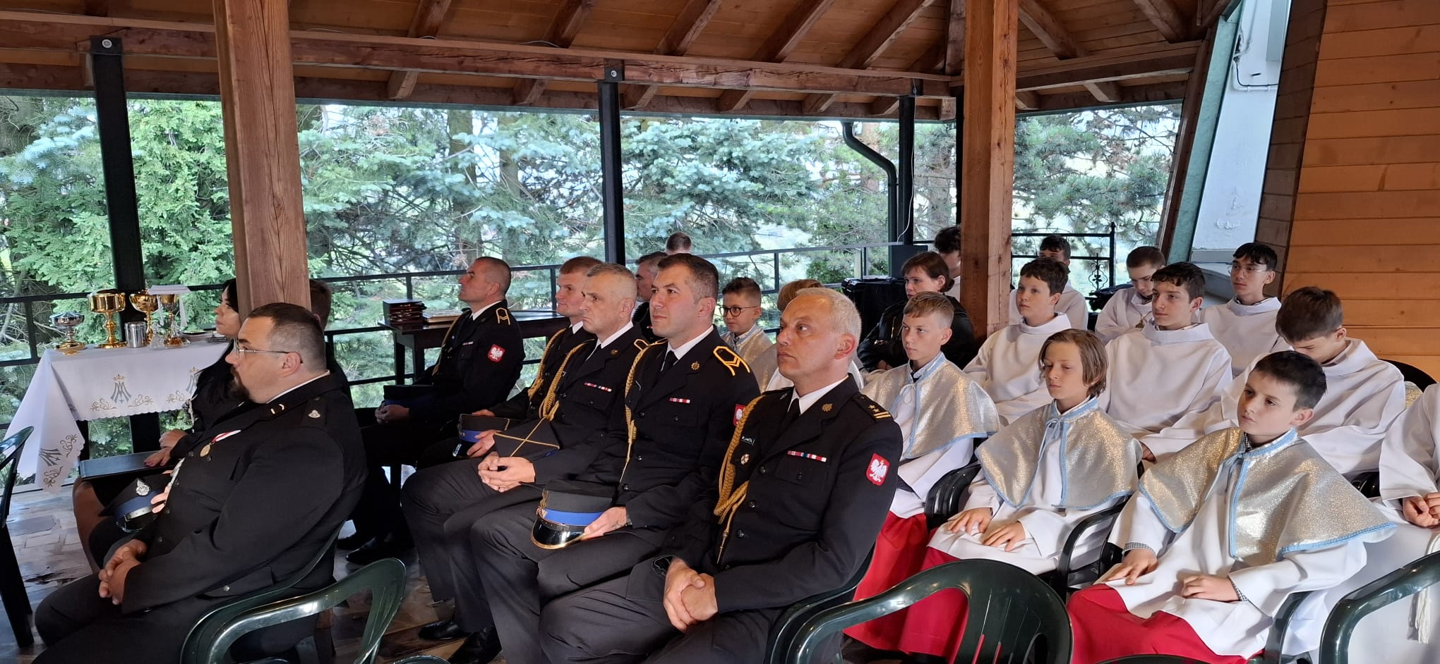 Na Mszy świętej zgromadzili się strażacy z rodzinami oraz licznie wierni a także :