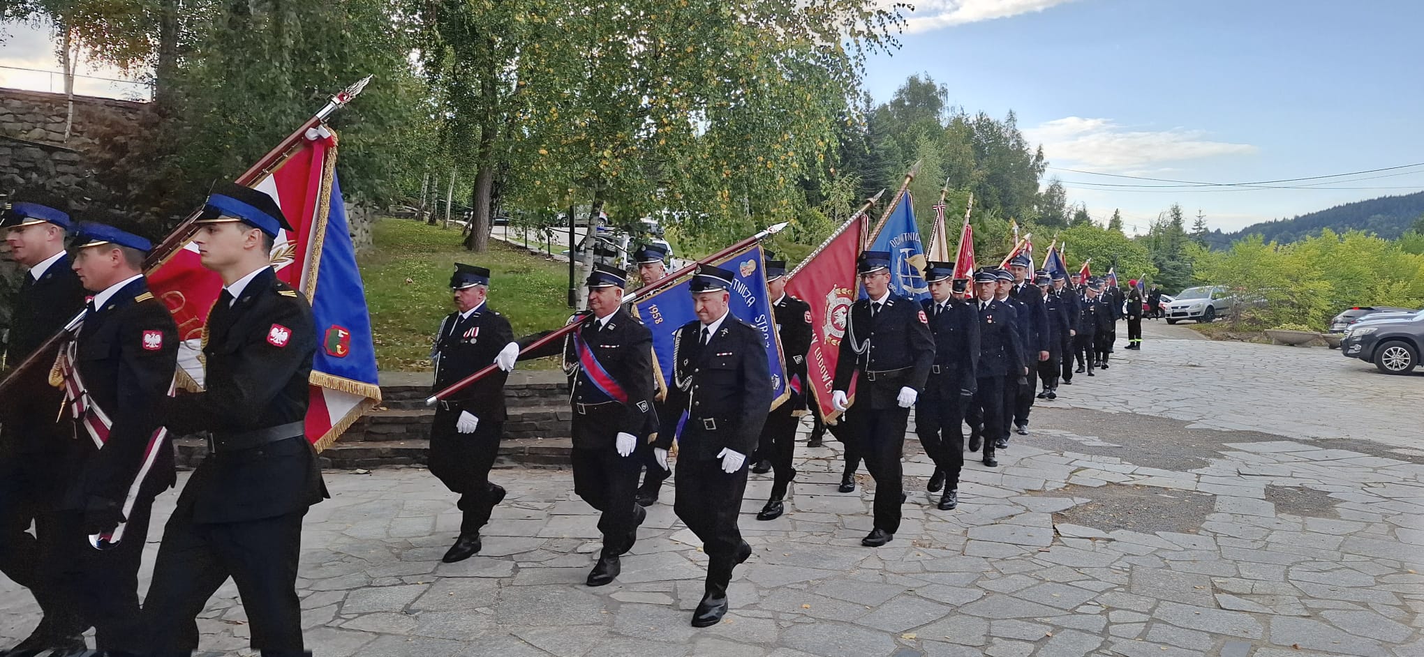 Prezesi i naczelnicy jednostek OSP z terenu powiatu limanowskiego z pocztami sztandarowymi.