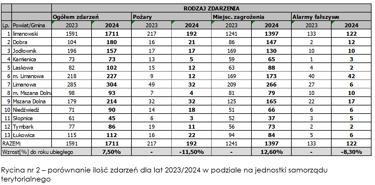 W 2024 roku na terenie powiatu limanowskiego miało miejsce ogółem 1711 zdarzeń wymagających udziału jednostek ochrony przeciwpożarowej w tym 192 pożary, 1397 miejscowych zagrożeń oraz 122 alarmy fałszywe. Miejscowe zagrożenia stanowiły prawie 81,6% wszystkich zdarzeń, pożary nieco ponad 11.2% a 7,1% to alarmy fałszywe.