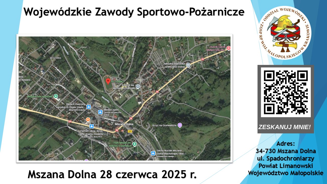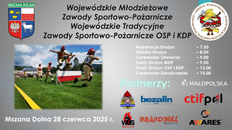 Już w najbliższą sobotę 28 czerwca 2025 r. w Mszanie Dolnej, powiat limanowski odbędą się Wojewódzkie Młodzieżowe Zawody Sportowo-Pożarnicze oraz Wojewódzkie Tradycyjne Zawody Sportowo-Pożarnicze Ochotniczych Straży Pożarnych i Kobiecych Drużyn Pożarniczych.