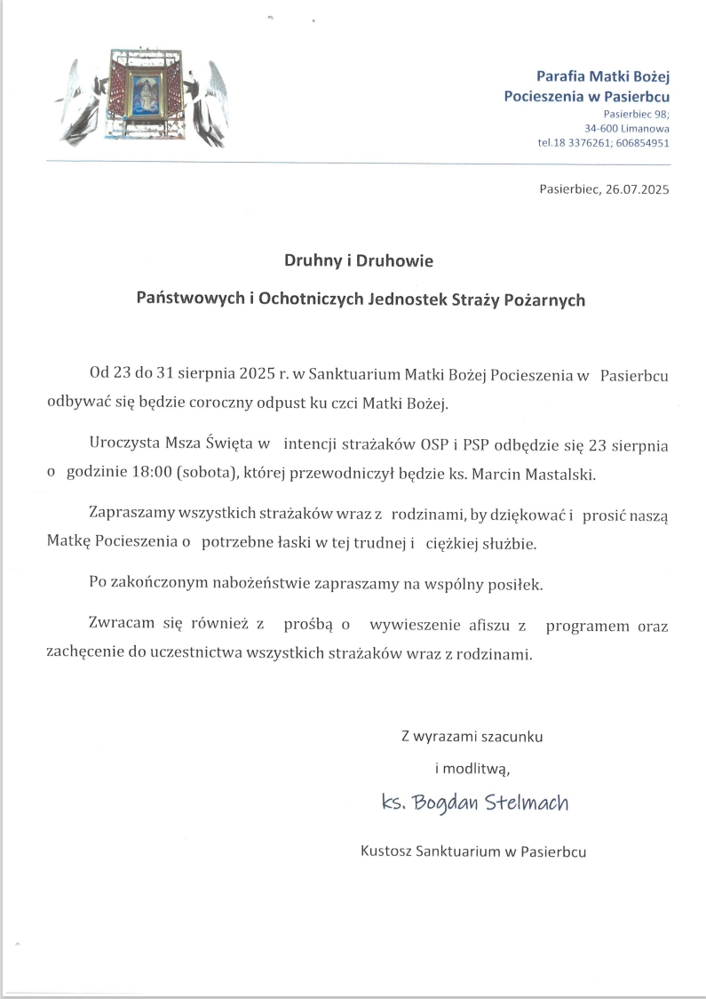 od 23 do 31 sierpnia 2025 r. w Sanktuarium Matki Bożej Pocieszenie w Pasierbu odbywać się będzie coroczny odpust ku czci Matki Bożej