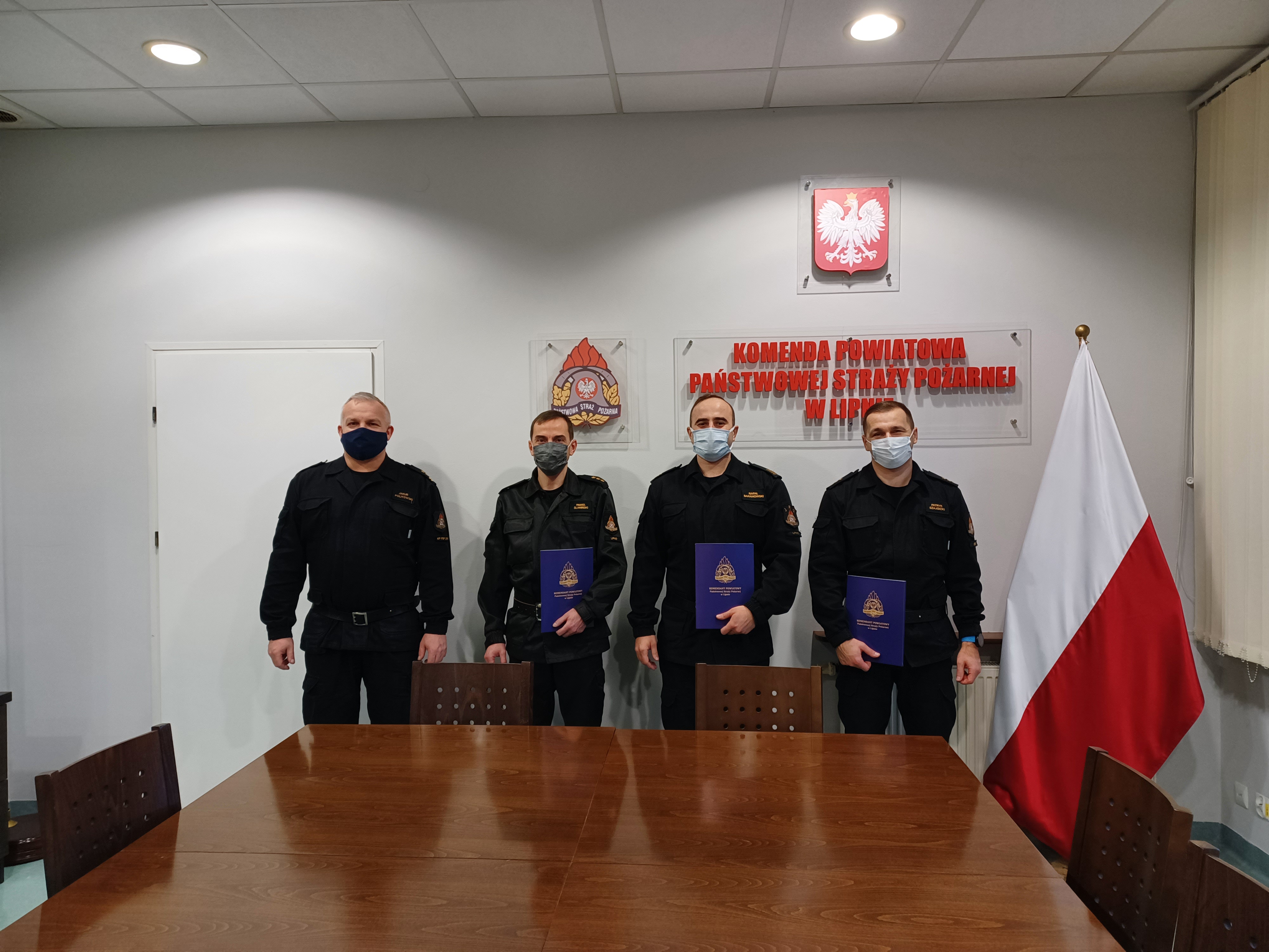 5 stycznia 2021 r. w Komendzie Powiatowej Państwowej Straży Pożarnej w Lipnie odbyła się uroczystość wręczenia aktu mianowania do służby stałej st. str. Kamilowi Gapińskiemu oraz aktów mianowania na wyższe stanowiska służbowe: