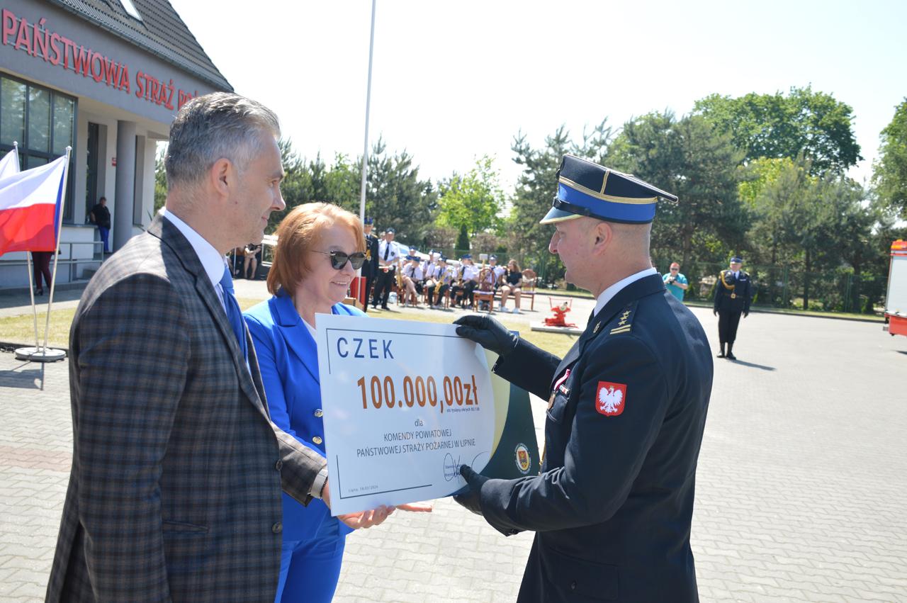 W czasie obchodów dokonano również przekazania Komendzie Powiatowej PSP w Lipnie nowego samochodu GBA 2,5/16 Renault. Zakupu średniego samochodu ratowniczo – gaśniczego dokonano ze środków pochodzących z dotacji Narodowego i Wojewódzkiego Funduszu Ochrony Środowiska i Gospodarki Wodnej – 1 209 888 tyś. zł oraz z dotacji Powiatu Lipnowskiego – 150 000 tyś. zł.