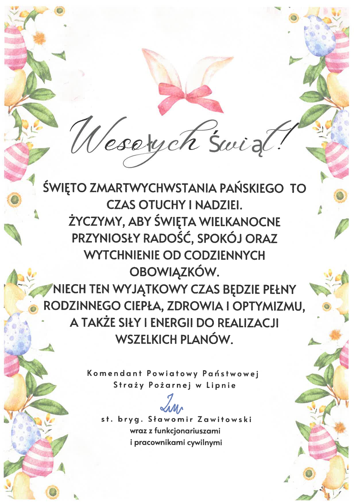 Życzenia Komendanta Powiatowego PSP w Lipnie z okazji Świąt Wielkanocnych 16.04.2025 Zdjęcia (1) Pokaż zdjęcie 1 z galerii.