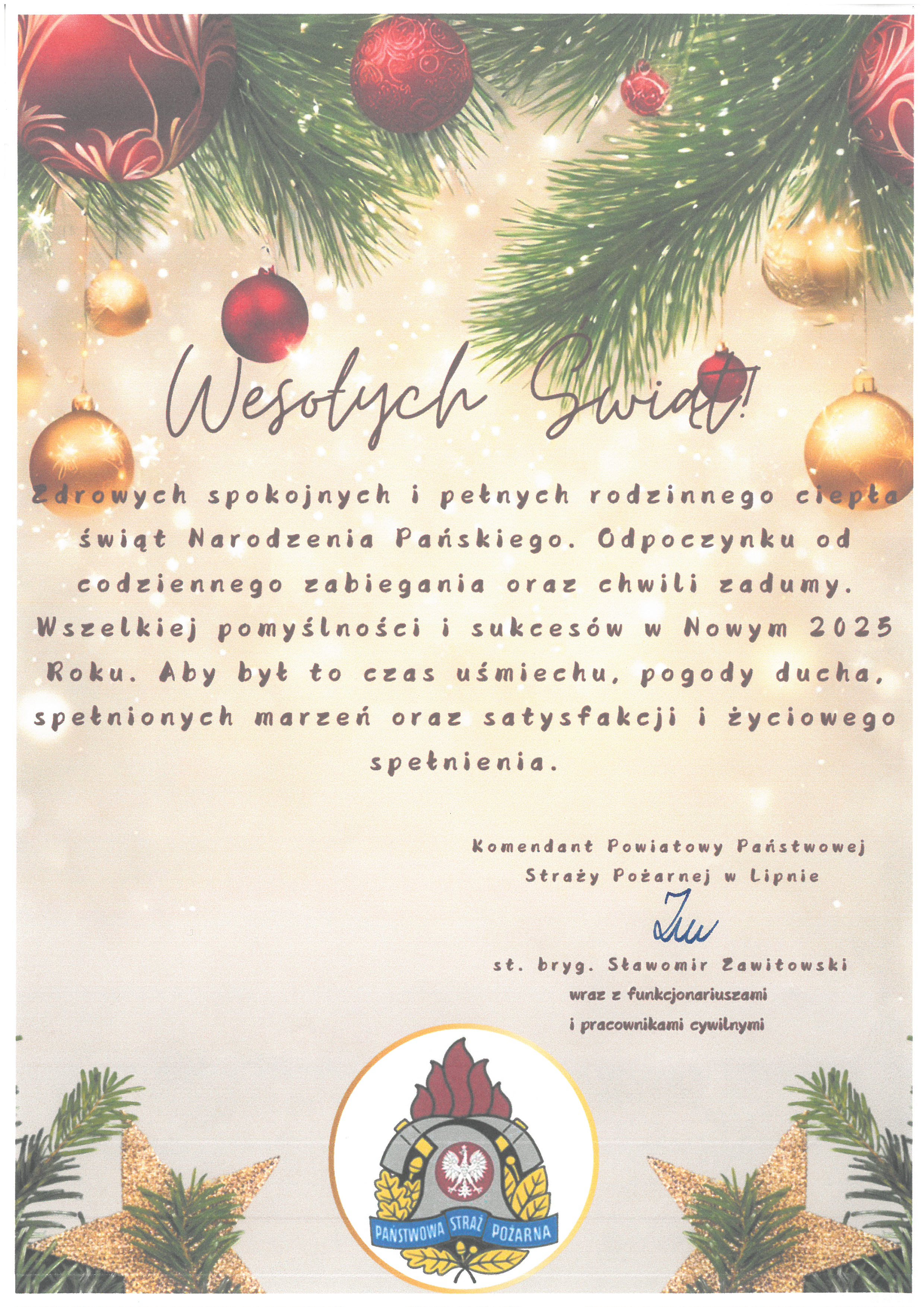 Zdrowych, spokojnych i pełnych rodzinnego ciepła świąt Narodzenia Pańskiego. Odpoczynku od codziennego zabiegania oraz chwili zadumy. Wszelkiej pomyślności i sukcesów w Nowym 2025 roku. Aby był to czas uśmiechu, pogody ducha, spełnionych marzeń oraz satysfakcji i życiowego spełnienia.
