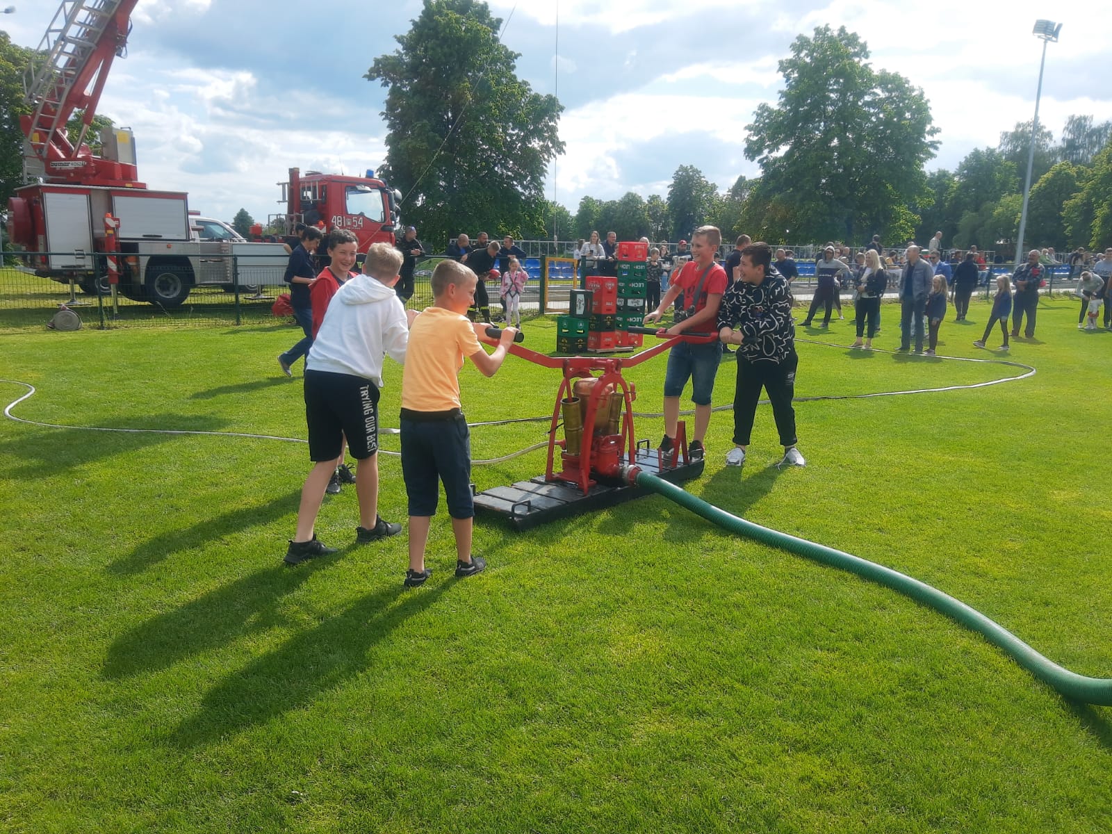 - pompowanie wody za pomocą starej pompy tłokowej, która siłą rąk zasysała wodę ze zbiornika a następnie trafiała do celu, za pomocą prądownicy trzymanej w rękach dzieci,