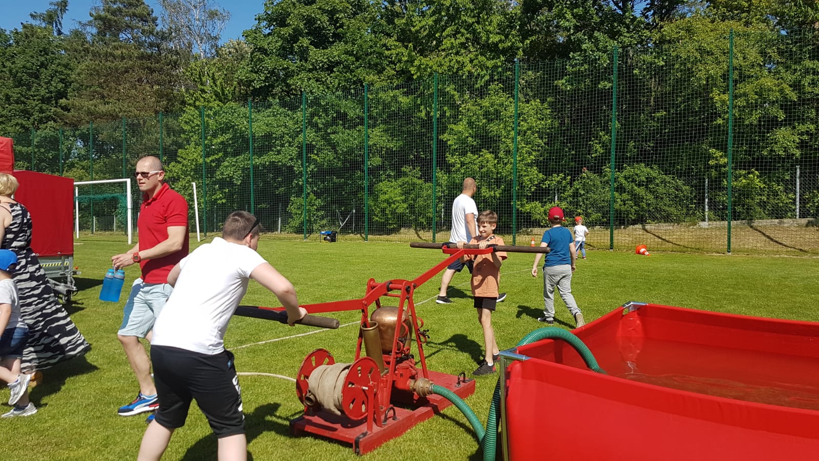 - pompowanie wody za pomocą starej pompy tłokowej, która siłą rąk zasysała wodę ze zbiornika a następnie trafiała do celu, za pomocą prądownicy trzymanej w rękach dzieci,
