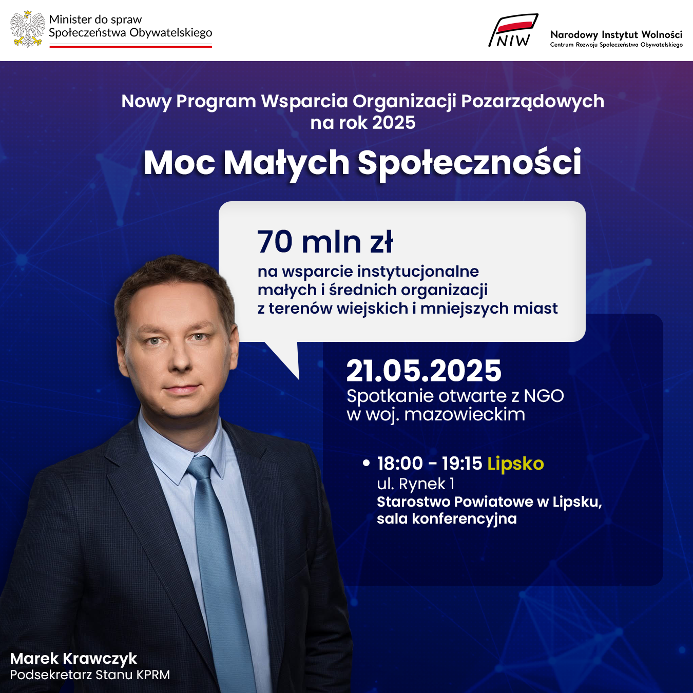 Ministra ds. Społeczeństwa Obywatelskiego Adriana Porowska oraz Podsekretarz Stanu w KPRM Marek Krawczyk serdecznie zapraszają przedstawicieli trzeciego sektora do udziału spotkaniach dotyczących nowego Rządowego Programu Wsparcia Organizacji Pozarządowych na rok 2025 - „Moc Małych Społeczności".