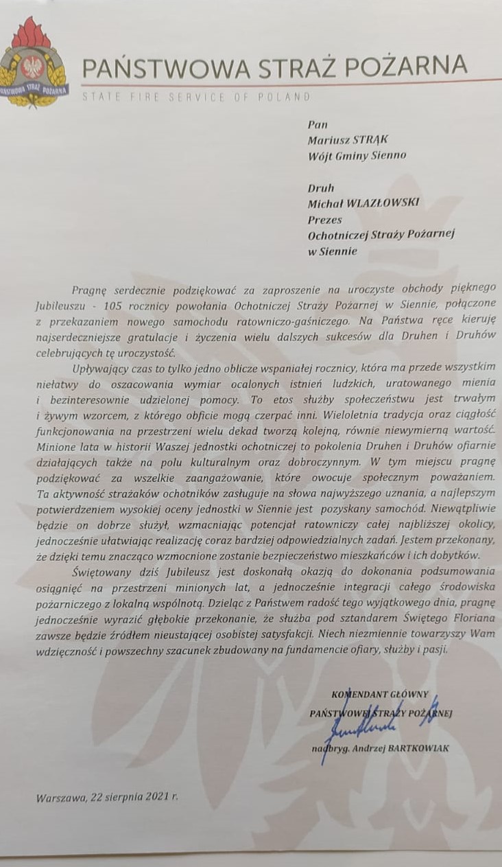 w Lipsku st. bryg. Tomasz Krzyczkowski, który jednocześnie odczytał list od Komendanta Głównego PSP nadbryg. Andrzeja Bartkowiaka. Po przekazaniu kluczyków dokonano aktu poświęcenia pojazdu pożarniczego przez ks. kan. dr Krzysztofa Maja kapelana strażaków powiatu lipskiego oraz ks. kan. Andrzeja Cieszkowskiego dziekana dekanatu sienieńskiego.
