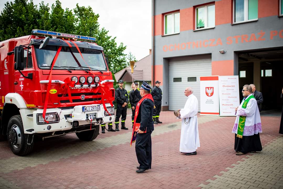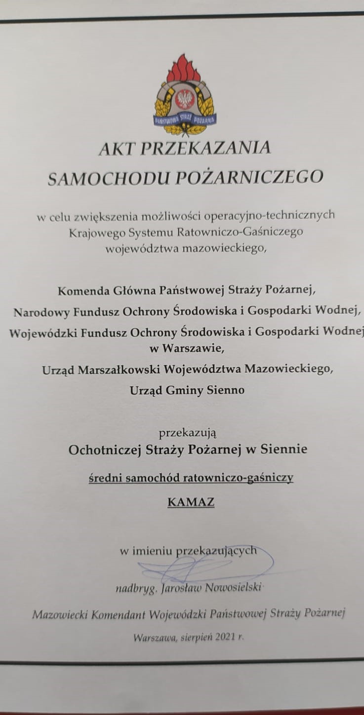 W celu zwiększenia możliwości operacyjno - technicznych Krajowego Systemu Ratowniczo- Gaśniczego dokonano przekazania i poświęcenia nowego średniego samochodu ratowniczo- gaśniczego GBA 3,6/16/360 KAMAZ. Akt przekazania samochodu w imieniu Mazowieckiego Komendanta Wojewódzkiego Państwowej Straży Pożarnej nadbryg. Jarosława Nowosielskiego dokonał Zastępca Naczelnika Wydziału Technicznego mł. bryg. Karol Ziętala oraz Komendant Powiatowy PSP