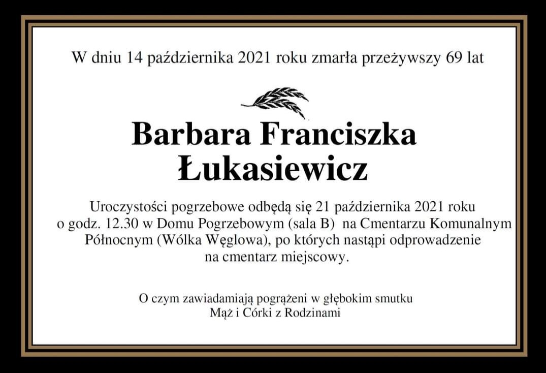 Z ogromnym smutkiem dowiedzieliśmy się i informujemy, że dnia 14 października 2021 r. zmarła nasza koleżanka Barbara Łukasiewicz V-ce Prezes Zarządu Głównego Związku Emerytów i Rencistów Pożarnictwa RP, Prezes Zarządu Mazowieckiego Oddziału Wojewódzkiego ZEiRP RP oraz przez wiele lat działała w Federacji Stowarzyszeń Służb Mundurowych RP. Pani Barbara Łukasiewicz uczestniczyła między innymi na terenie powiatu lipskiego w uroczystościach 60- lecia powstania pierwszej Komendy Powiatowej Straży Pożarnych w Lipsku w dniu 11.11.2016 r. oraz w dniu 24 listopada 2018r. w świetlicy Komendy Powiatowej Państwowej Straży Pożarnej w Lipsku w uroczystym apelu z okazji 100-rocznicy odzyskania przez Polskę Niepodległości, a także w innych posiedzeniach Koła Związku Emerytów i Rencistów Pożarnictwa RP w Lipsku.