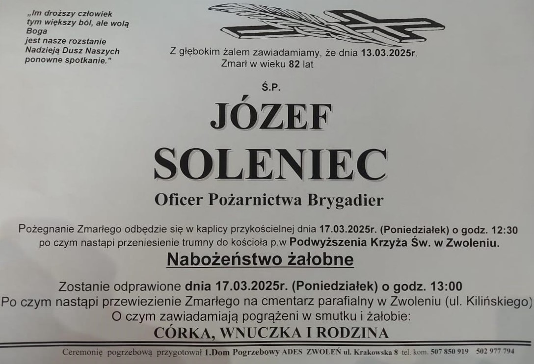 Z głębokim smutkiem informujemy, że dnia 13 marca 2025 r. zmarł bryg. w st. spocz. Józef Soleniec – Komendant Rejonowy i Powiatowy PSP w Lipsku w latach 1968 - 1981.