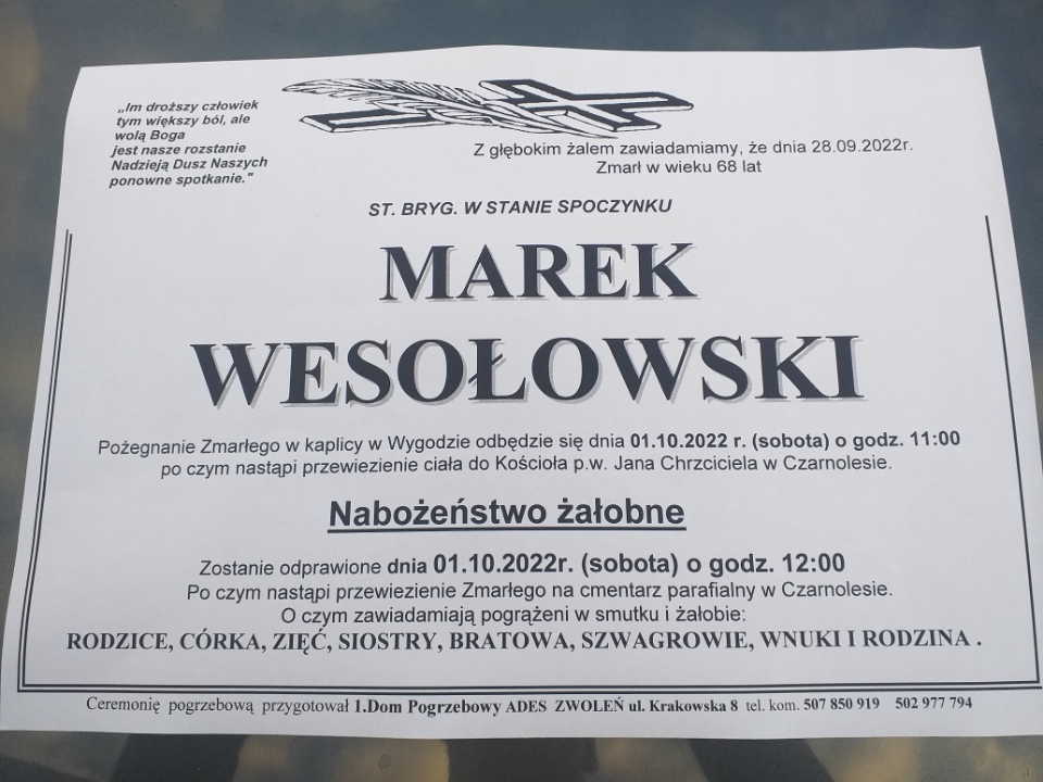 Z głębokim smutkiem informujemy, że w dniu 28 września 2022 roku odszedł w wieku 68 lat na wieczną służbę st. bryg. w st. spoczynku Marek Wesołowski, były Komendant Powiatowy Państwowej Straży Pożarnej w Lipsku, oficer byłej Komendy Wojewódzkiej PSP w Radomiu oraz były Komendant Wojewódzkiego Ośrodka Szkolenia Pożarniczego w Kozienicach, członek OSP w Czarnolesie.