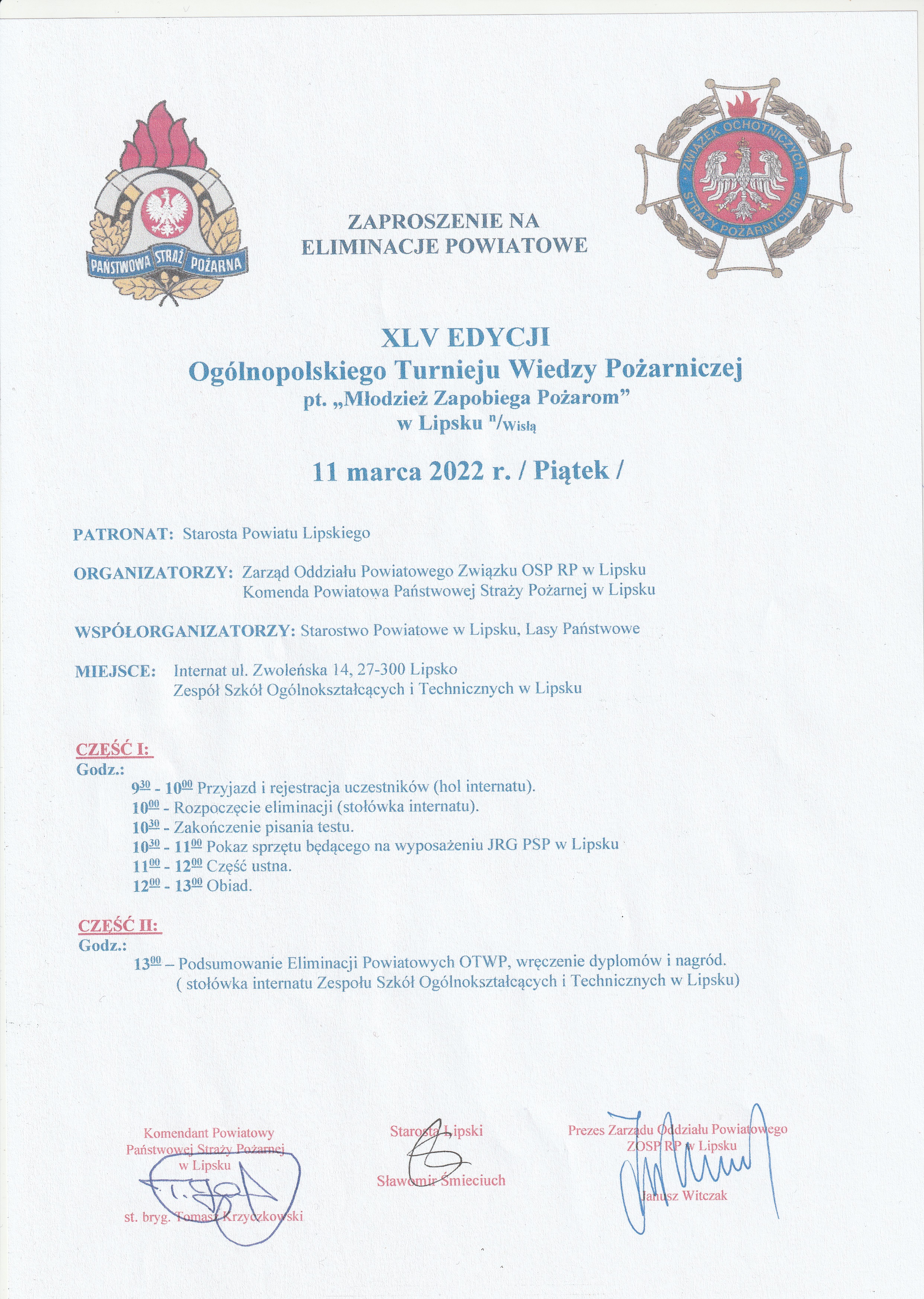 Dnia 11 marca 2022 r. w Internacie Zespołu Szkół Ogólnokształcących i Technicznych w Lipsku, odbędą się powiatowe eliminacje XLV Ogólnopolskiego Turnieju Wiedzy Pożarniczej pod hasłem „Młodzież Zapobiega Pożarom”.