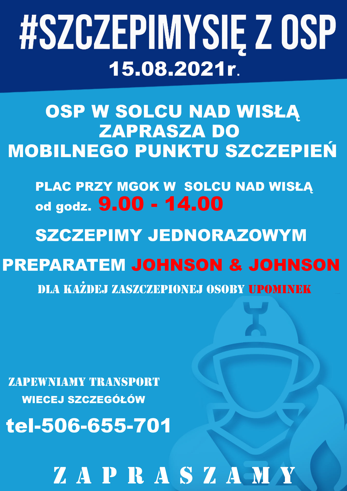 W dniu 15.08.2021 r. w godz. 9.00-14.00 OSP Solec nad Wisłą zaprasza na szczepienie przeciwko Covid-19 do mobilnego punktu szczepień zorganizowanego przy placu MGOK w Solcu nad Wisłą.