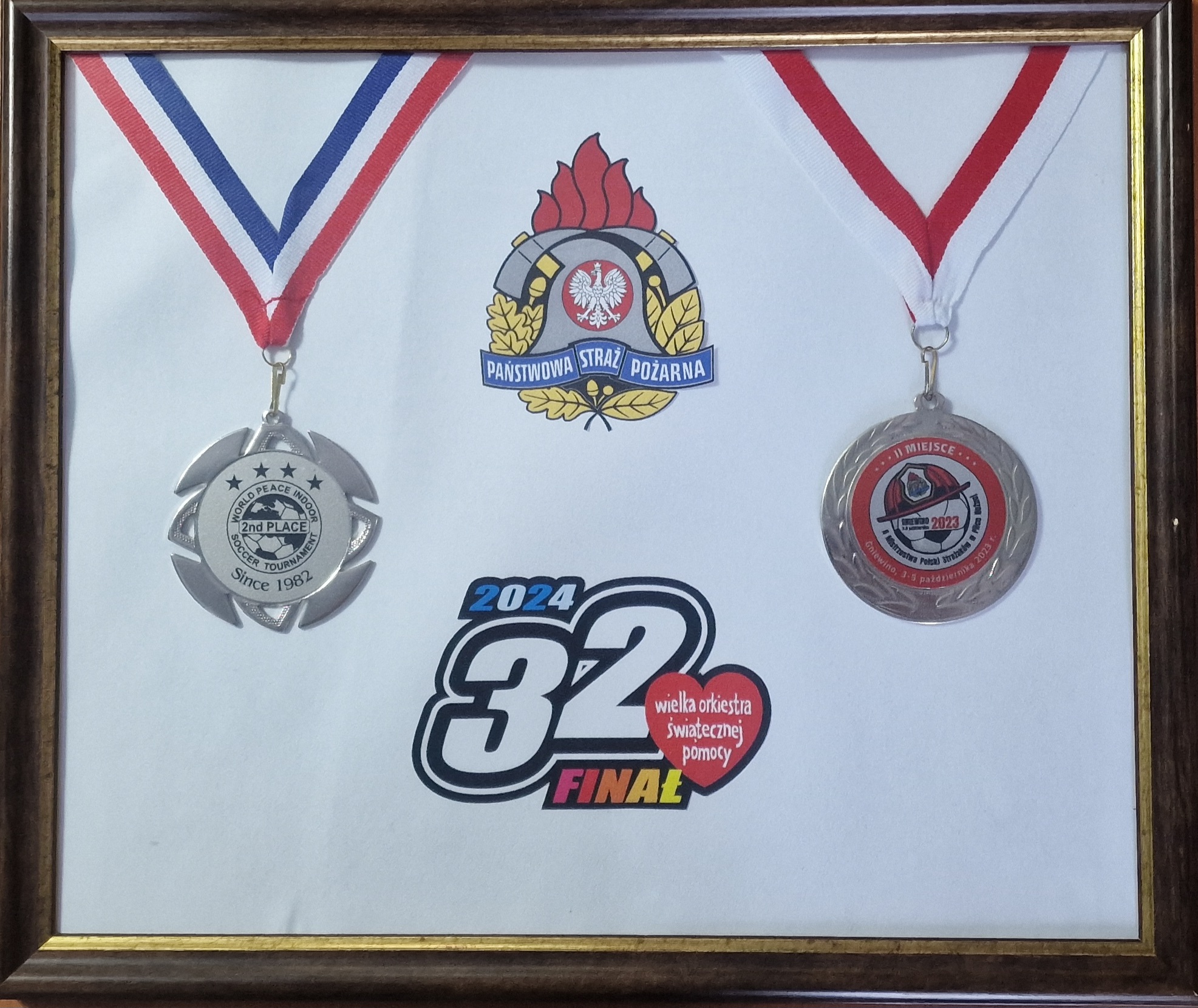 Medal po lewej - W dniach 20-24 listopada 2023 roku w Holandii rozegrany został Światowy Turniej Piłki Nożnej Służb Mundurowych. Reprezentacja Polskich Strażaków Państwowej Straży Pożarnej została wicemistrzami świata.