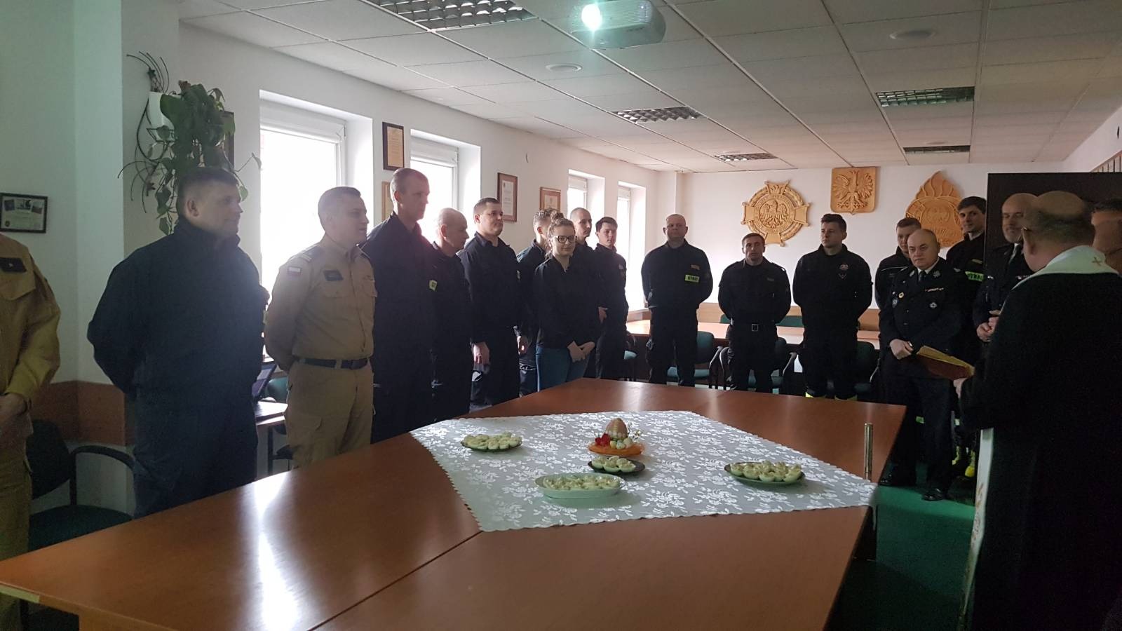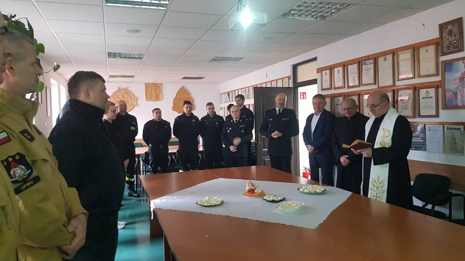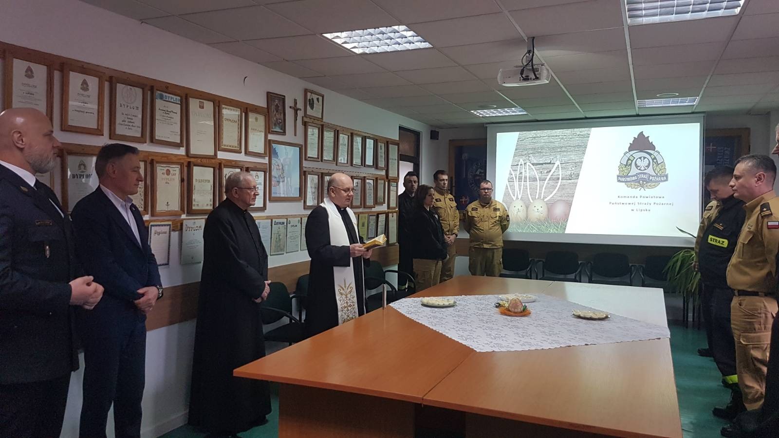 W dniu 6 kwietnia w Komendzie Powiatowej Państwowej Straży Pożarnej w Lipsku odbyło się spotkanie, podczas którego funkcjonariusze i pracownicy cywilni komendy złożyli sobie świąteczne życzenia. Podczas spotkania życzenia spokojnych, rodzinnych świąt przekazał wszystkim Komendant Powiatowy PSP w Lipsku st. bryg. Łukasz Maciejewski, a świąteczne potrawy symbolicznie poświęcił ks. kan. dr Krzysztof Maj Kapelan Strażaków Powiatu Lipskiego.