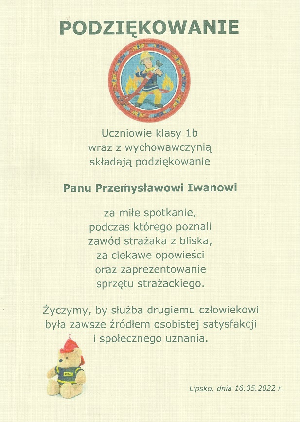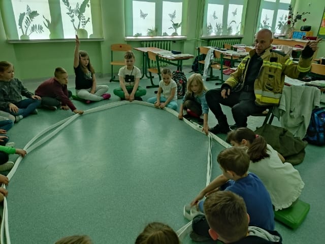 16 maja strażak z Państwowej Straży Pożarnej z Lipska odwiedził pierwszaków w Publicznej Szkole Podstawowej im. A.G. Bema w Lipsku. Podczas wizyty przedstawiona została postać strażaka i jak przebiega jego służba oraz wskazano jakiego sprzętu używa przy niesieniu pomocy. Omówiono również jak prawidłowo zachować się w przypadku powstania pożaru, wskazano zasady zgłaszania zdarzeń na numery alarmowe oraz nakreślono bezpieczne zachowania w życiu codziennym.