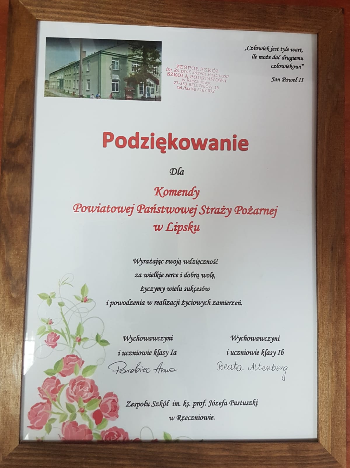 Za miłe spotkanie dzieci podziękowały strażakom wręczając dyplom oraz własnoręcznie zrobione repliki wozów pożarniczych.