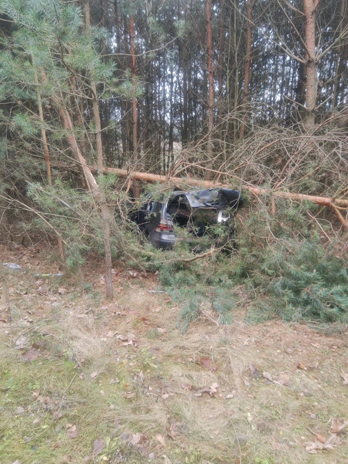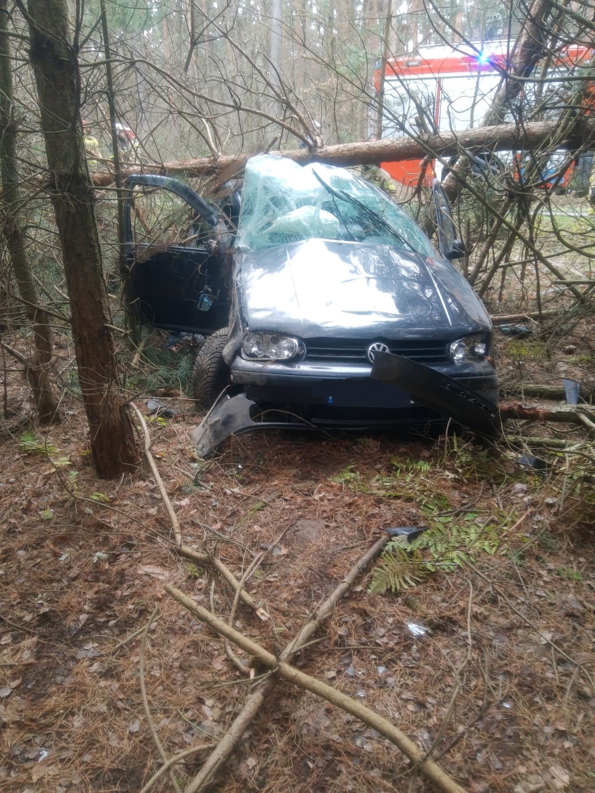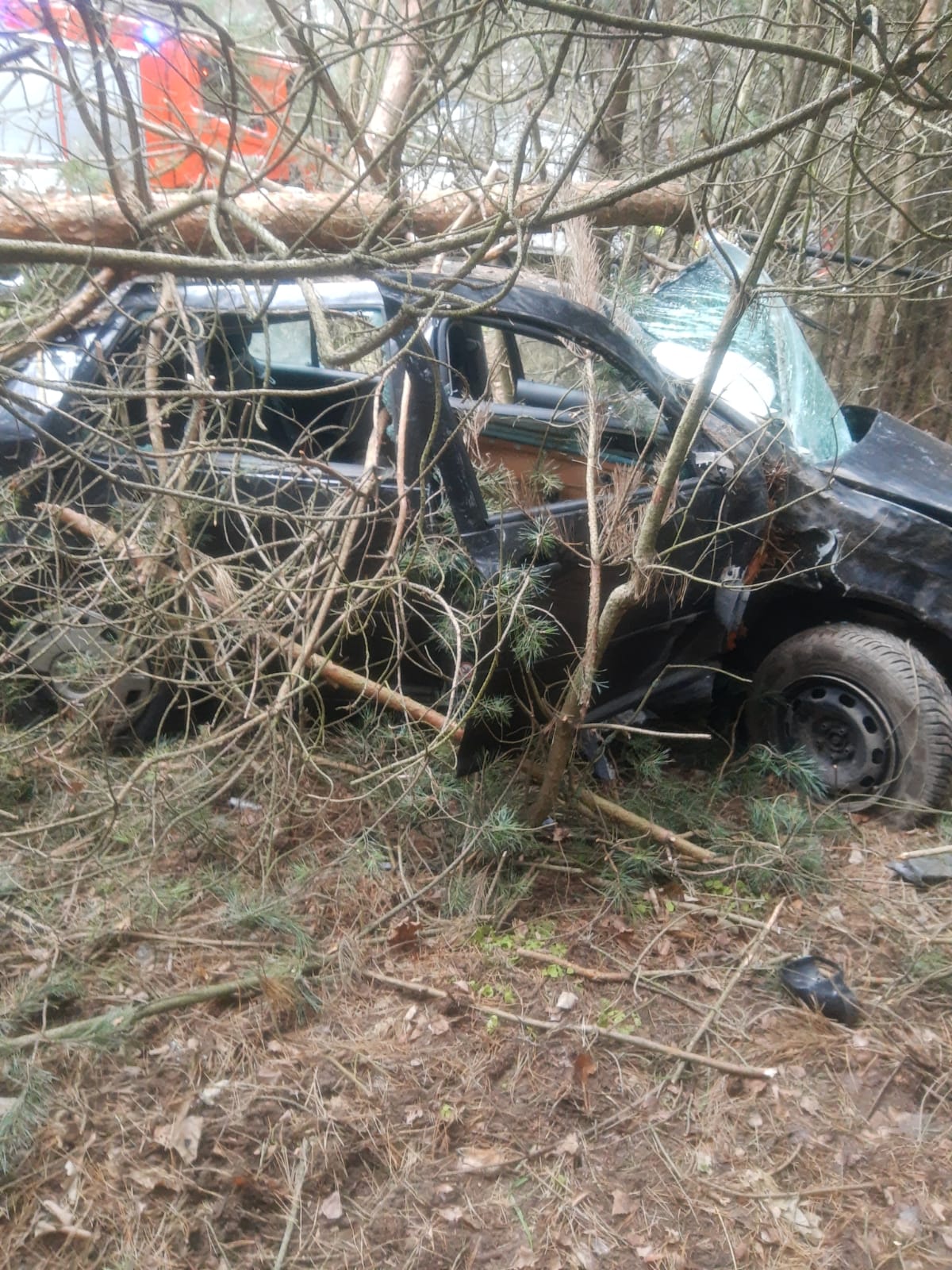 W dniu 5 grudnia br. w miejscowości Czerwona, gm. Ciepielów doszło do wypadku pojazdu osobowego VW Golf, który w wyniku wystrzału opony wjechał do pobliskiego lasu. Pojazdem podróżował wyłącznie kierowca który opuścił go o własnych siłach przed przybyciem służb ratowniczych lecz potrzebował pomocy medycznej. Strażacy oprócz udzielania kwalifikowanej pierwszej pomocy poszkodowanemu, zabezpieczyli miejsce zdarzenia, odłączyli dopływ prądu w pojeździe, kierowali ruchem drogowym oraz uprzątnęli pozostałości powypadkowe.