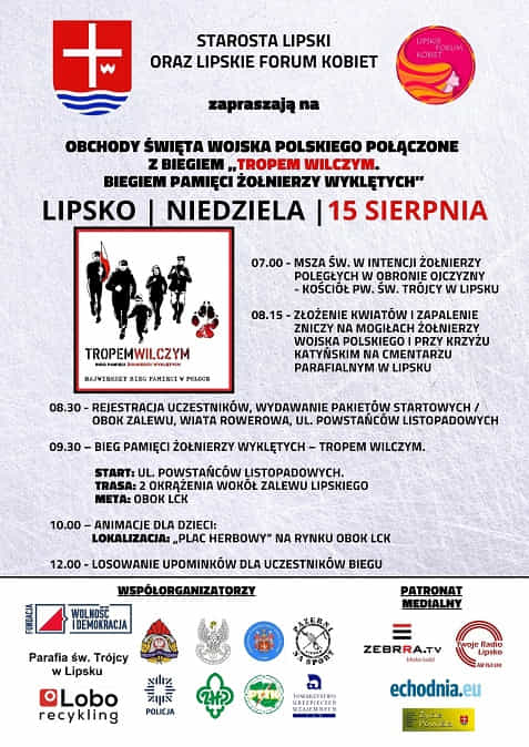 - 09.30 - Bieg Pamięci Żołnierzy Wyklętych - TROPEM WILCZYM. Start: ul. Powstańców listopadowych. Trasa: 2 okrążenia wokół zalewu lipskiego meta: obok LCK