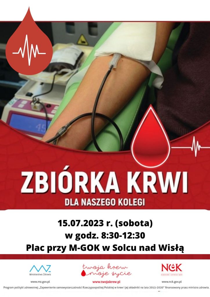 Zachęcamy do udziału w zbiórce krwi dla strażaka z Ochotniczej Straży Pożarnej w Solcu nad Wisłą, który w dniu 10 lipca br. uległ wypadkowi.