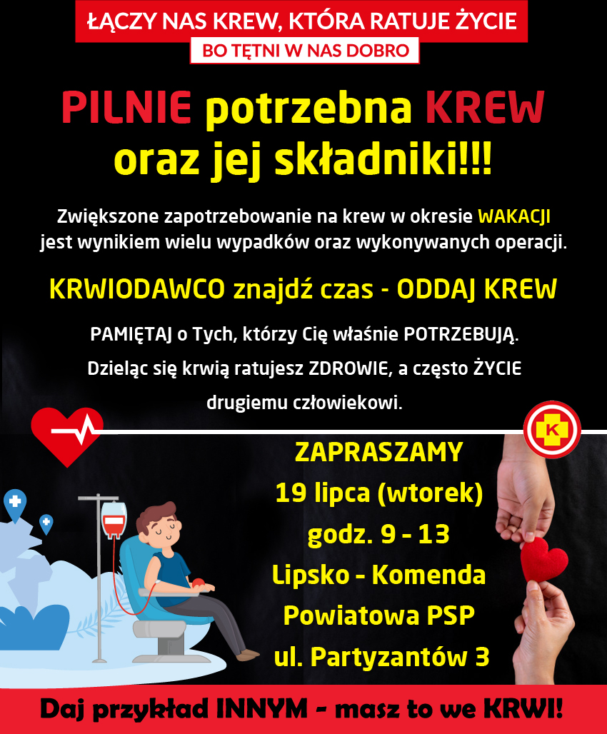Komenda Powiatowa PSP w Lipsku działając we współpracy z Zarządem Oddziału Powiatowego Związku OSP RP w Lipsku odpowiada na apel Regionalnego Centrum Krwiodawstwa i Krwiolecznictwa w Radomiu.