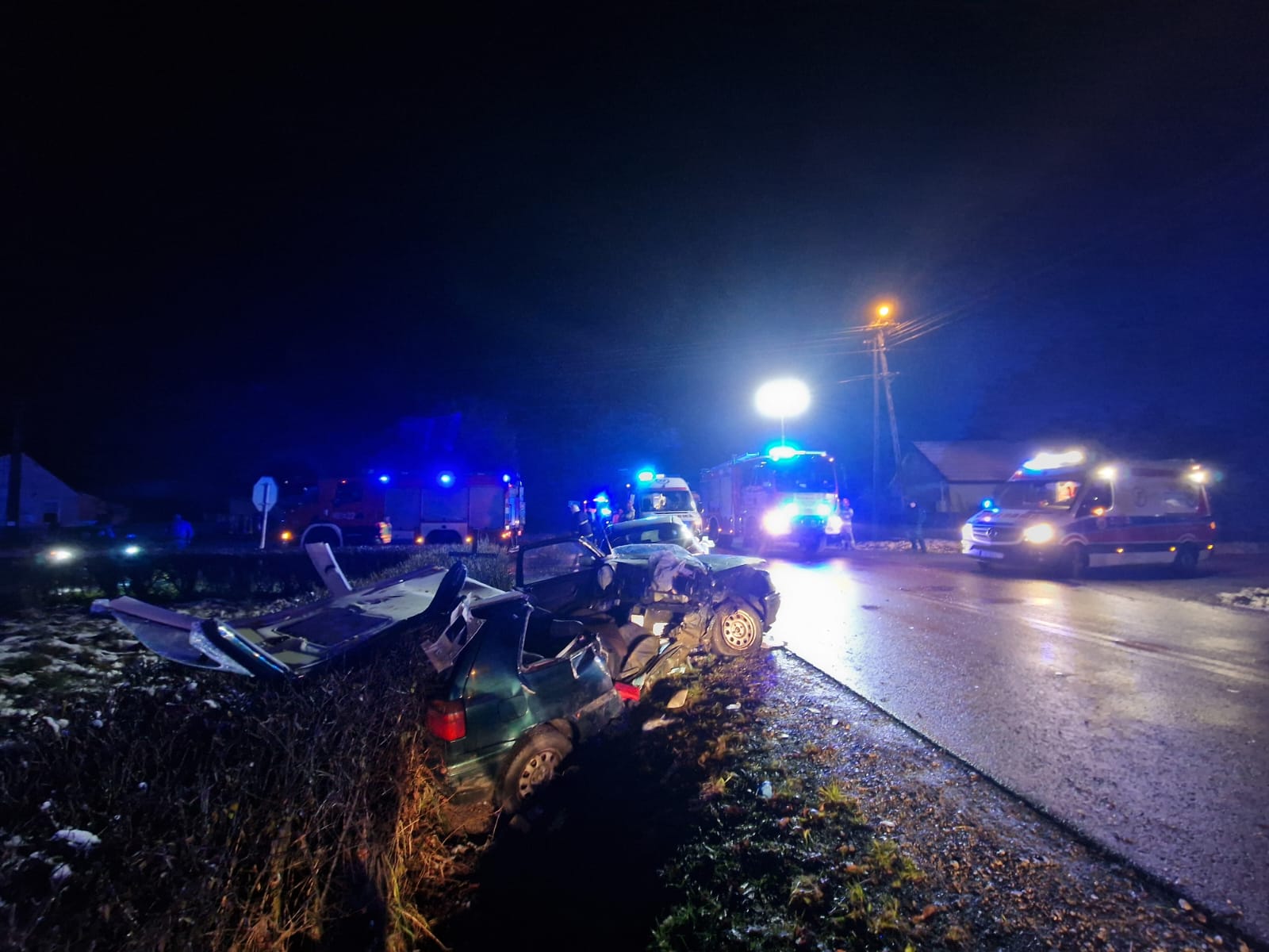 Pojazdami podróżowało łącznie pięć osób, trzy Hondą oraz dwie VW - które były zakleszczone w pojeździe. Strażacy zabezpieczyli miejsce zdarzenia, oświetlili teren akcji ratowniczej, wykonali dostęp do osoby zakleszczonej, ewakuowali osoby poszkodowane z miejsca zdarzenia, udzielali kwalifikowanej pierwszej pomocy poszkodowanym, kierowali ruchem drogowym.