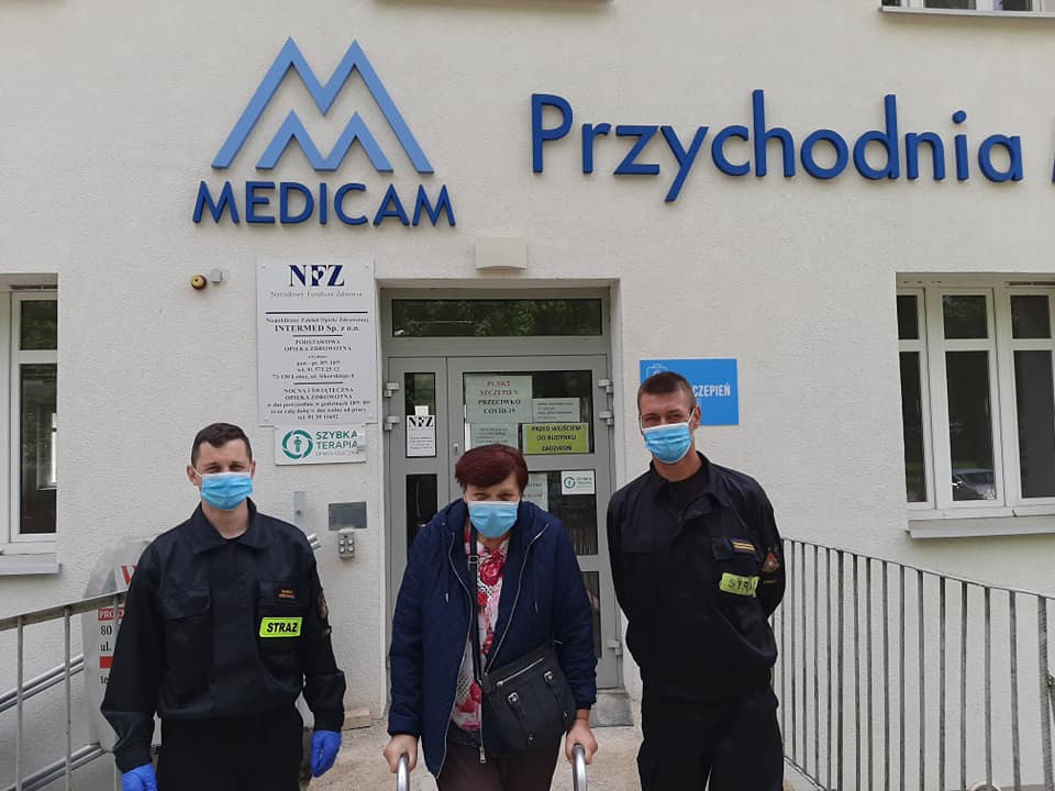 Starsza Pani została sprowadzona przez strażaków po klatce schodowej i przewieziona na szczepienie.