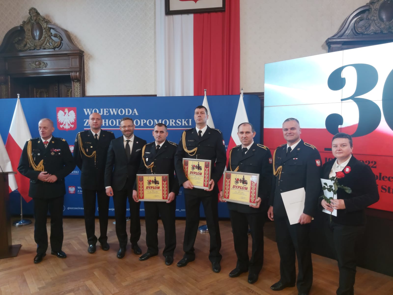 23 listopada 2022 r. w Sali Rycerskiej Zachodniopomorskiego Urządu Wojewódzkiego odbył się uroczysty apel, podczas którego funkcjonariuszom i pracownikom cywilnym Państwowej Straży Pożarnej wręczone zostały nagrody, odznaczenia, wyróżnienia oraz awanse na wyższe stopnie służbowe z okazji Narodowego Święta Niepodległości. Uroczystość rozpoczęła się od wprowadzenia sztandaru, po czym głos zabrał Zachodniopomorski Komendant Wojewódzki Państwowej Straży Pożarnej, nadbryg. Jarosław Tomczyk. Następnie Wojewoda Zachodniopomorski pan Zbigniew Bogucki oraz Zachodniopomorski Komendant Wojewódzki Państwowej Straży Pożarnej wręczyli pracownikom Korpusu Służby Cywilnej Państwowej Straży Pożarnej nagrody z okazji 100 – lecia służby cywilnej. Z okazji jubileuszu 30 – lecia Państwowej Straży Pożarnej, za wkład w tworzenie profesjonalnej i wyspecjalizowanej formacji, podziękowanie oraz medal okolicznościowy otrzymali byli Zachodniopomorscy Komendanci Wojewódzcy Państwowej Straży Pożarnej: st. bryg. w stanie spoczynku Wojciech Brodniewicz, st. bryg. w stanie spoczynku Stanisław Lenart, nadbryg. w stanie spoczynku Marek Kowalski, nadbryg. w stanie spoczynku Henryk Cegiełka i nadbryg. w stanie spoczynku Jacek Staśkiewicz oraz zasłużeni weterani pożarnictwa: bryg. w stanie spoczynku Ludwik Sabeł, bryg. w stanie spoczynku Jan Rysz i asp. w stanie spoczynku Alicja Łaput.