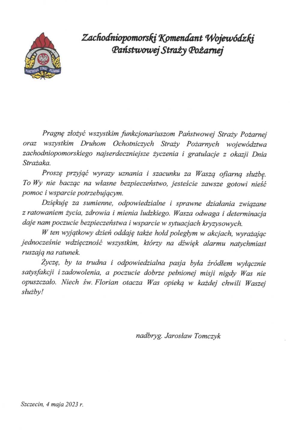 Życzenia Zachodniopomorskiego Komendanta Wojewódzkiego Państwowej Straży Pożarnej w Szczecinie z okazji Dnia Strażaka 2023