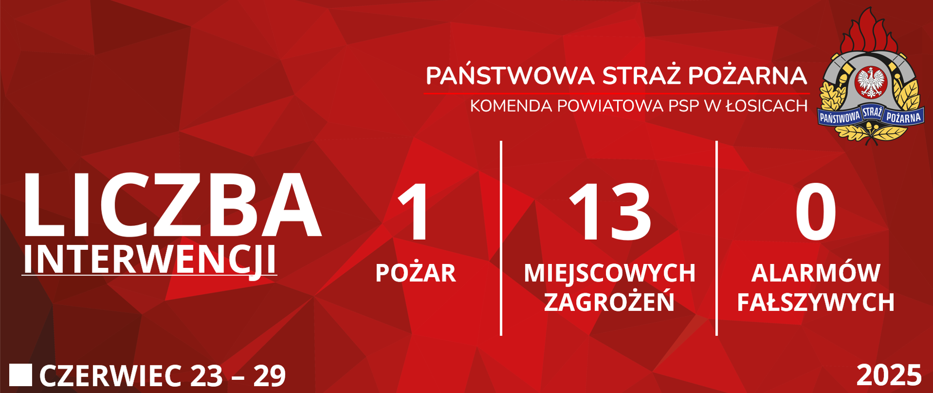 29.12.2025 KP PSP ŁosiceLiczba interwencji: 22 - 28 Grudzień 2025W dniach 22 - 28 grudnia 2025 roku na terenie powiatu łosickiego miały miejsce 3 pożary, 6 miejscowych zagrożeń i 1 alarm fałszywy.