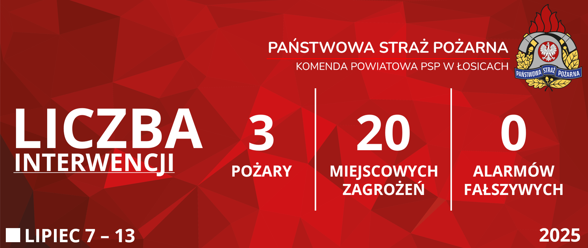 12.01.2026 KP PSP ŁosiceLiczba interwencji: 5 - 11 Styczeń 2026W dniach 5 - 11 stycznia 2026 roku na terenie powiatu łosickiego miał miejsce 1 pożar, 7 miejscowych zagrożeń i 0 alarmów fałszywych.