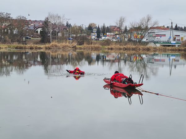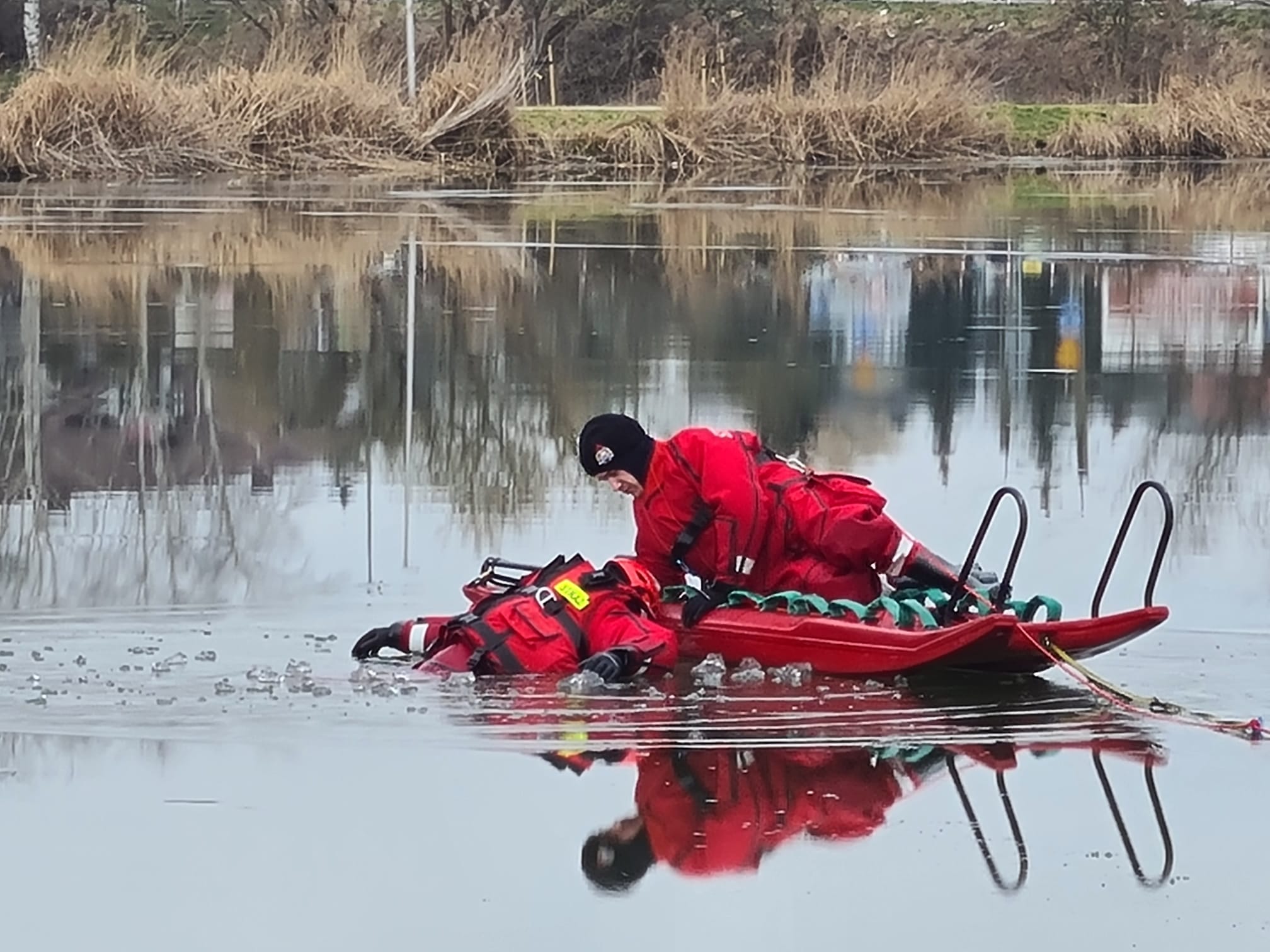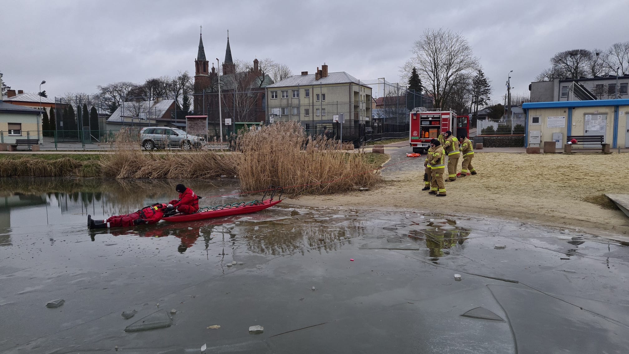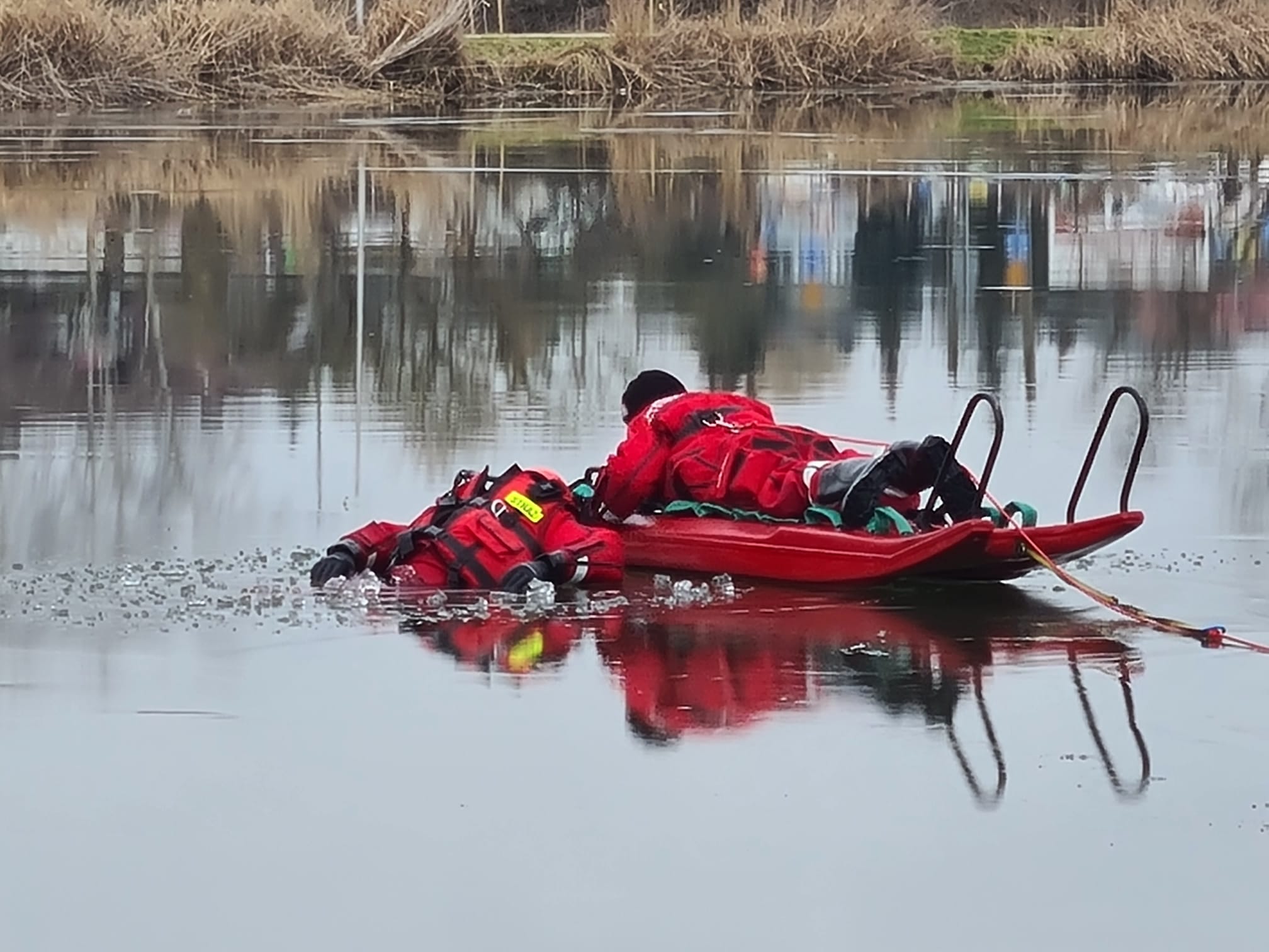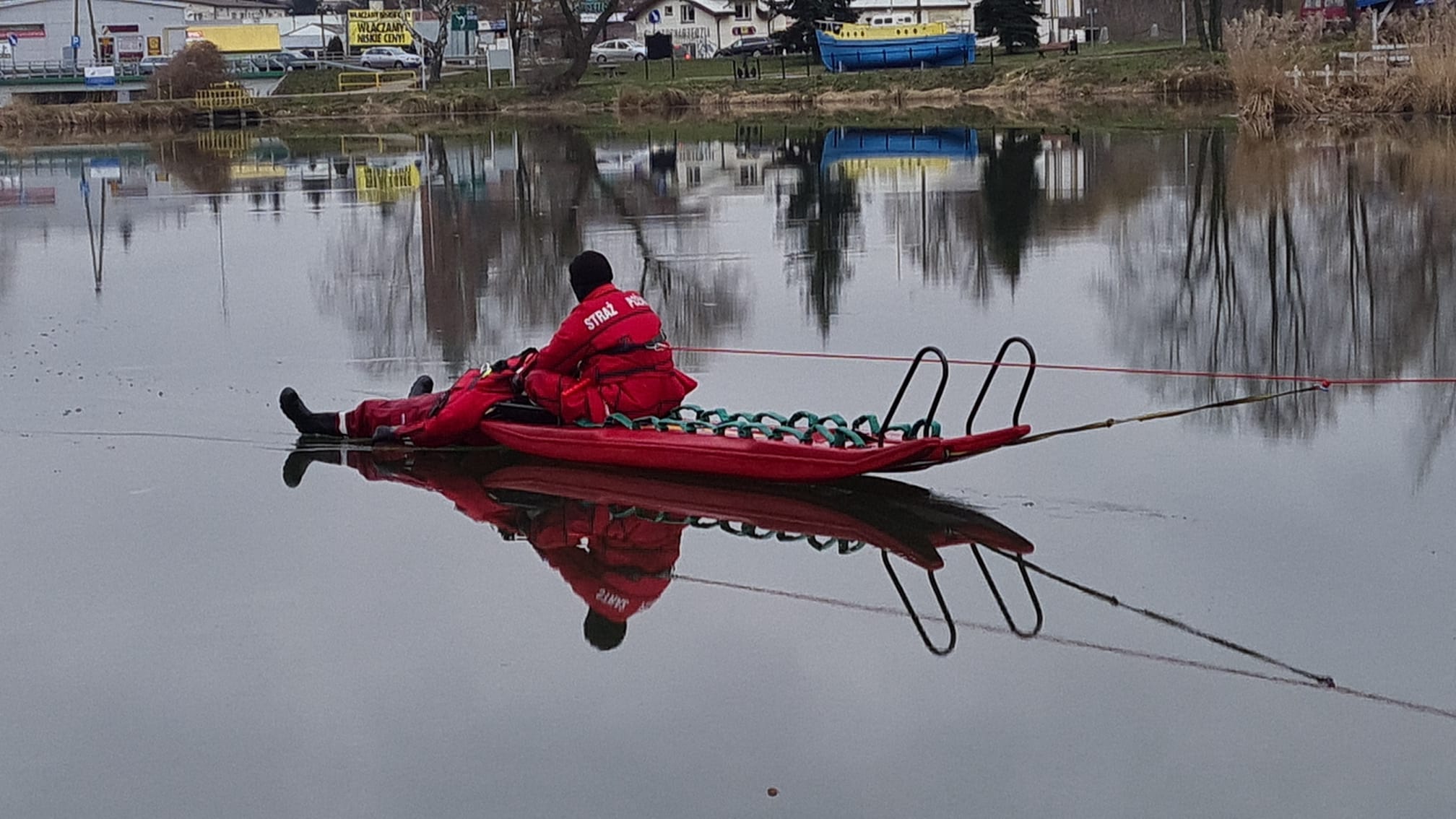 Ratownik ubrany w specjalny kombinezon miał za zadanie na saniach lodowych dotrzeć do osoby poszkodowanej, wydostać ją z lodowatej wody i ewakuować na brzeg.