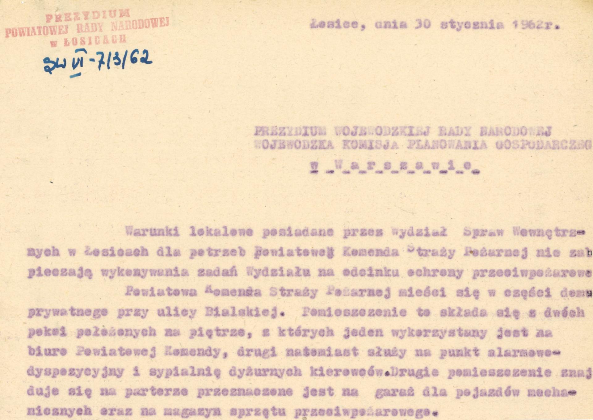 Opis warunków lokalnych Powiatowej Komendy Straży Pożarnych w Łosicach - 1962 r.