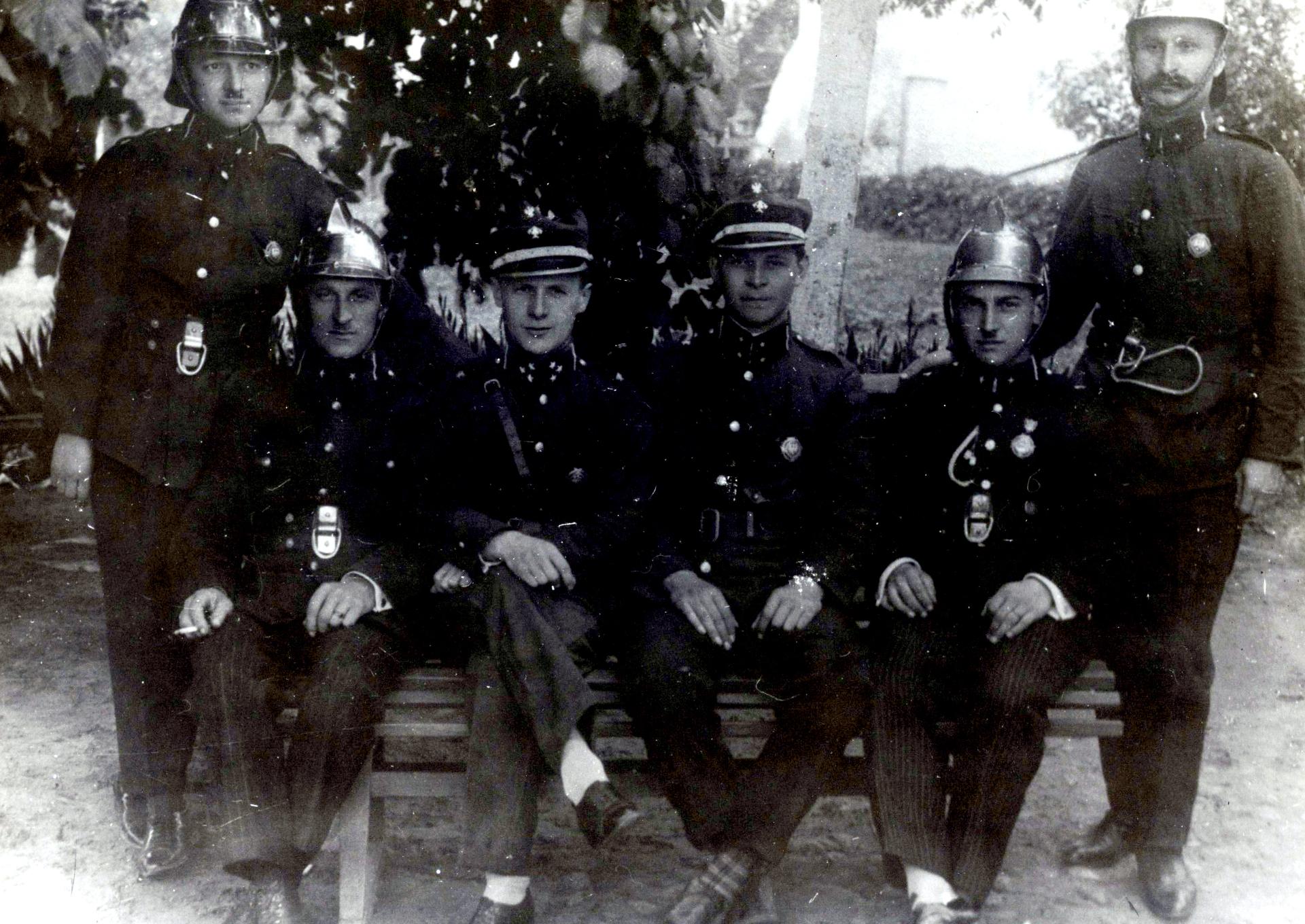 Od lewej stoją: Antoni Kowalewski - oddziałowy beczkowozów, Teofil Kasprzyk - oddziałowy toporników. Siedzą od lewej: Stefan Ostapski - oddziałowy oddziału sikawkowego, Jerzy Below - naczelnik straży, Julian Baran - zastępca naczelnika, Wiesław Twarowski - adiutant komendanta.