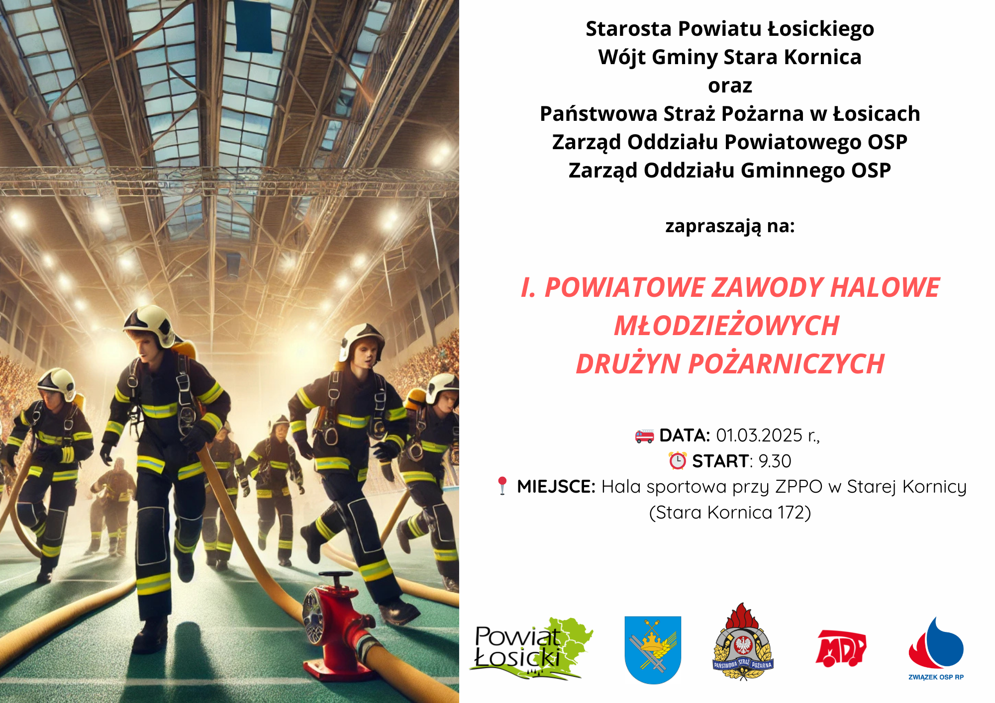 1 marca 2025 r. o godz. 9:30 w hali sportowej przy Zespole Publicznych Placówek Oświatowych im. Odzyskania Niepodległości w Starej Kornicy Stara Kornica 172, 08-205 Stara Kornica odbędą się I Powiatowe Zawody Halowe Młodzieżowych Drużyn Pożarniczych powiatu łosickiego.